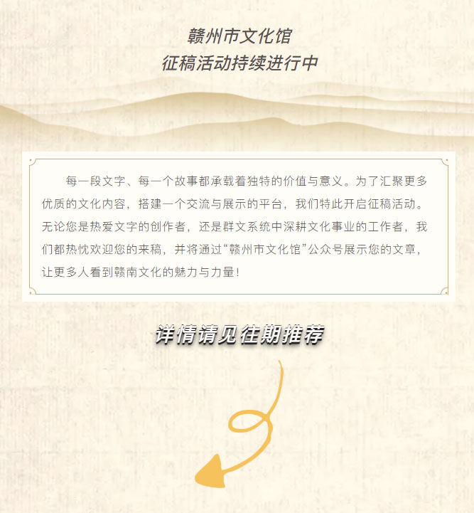 ※ 特别声明:本公众号仅用于赣州市文化馆公共文化服务及群众文化艺术普及,不用于任何商业用途。所转载文章及图片、视频、音频等版权均属原作者。如有侵权,请及时与本公众号联系。