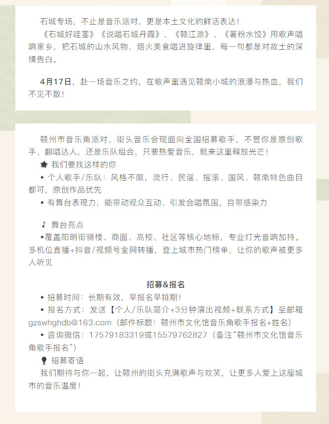 赣文轻骑兵 | 4月17日赣州音乐角派对·石城专场节目单官宣!