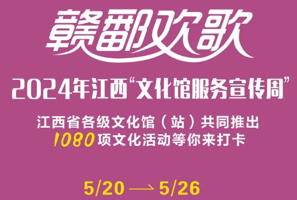 2024年5月20日—5月26日章贡区“文化馆服务宣传周”系列活动即将拉开帷幕摄影作品展览、非遗进校园、群众文艺演出、艺术培训等活动精彩纷呈下面让小编一起带大家看看吧~~