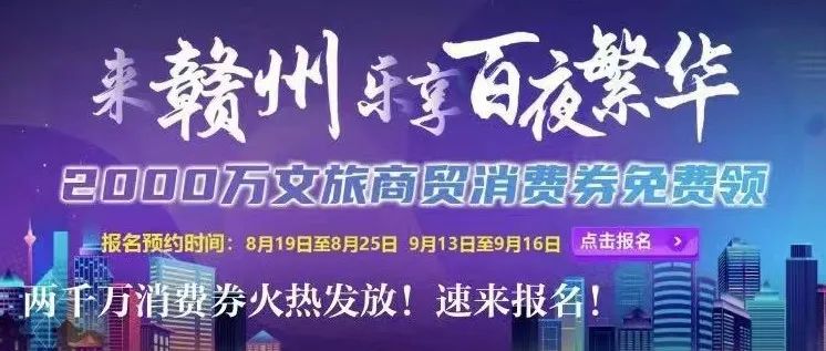 注意啦注意啦!2000万消费券来了!来赣南红免费领!明天10点开始预约如何报名?一起看过来!长按识别上方二维码或应用市场搜索下载赣南红客户端快人一步第一时间预约报名抢券为激活文旅商贸消费潜力,积极做好“百城百夜”文旅消费季活动,促进中秋、国庆假期文旅商贸消费…