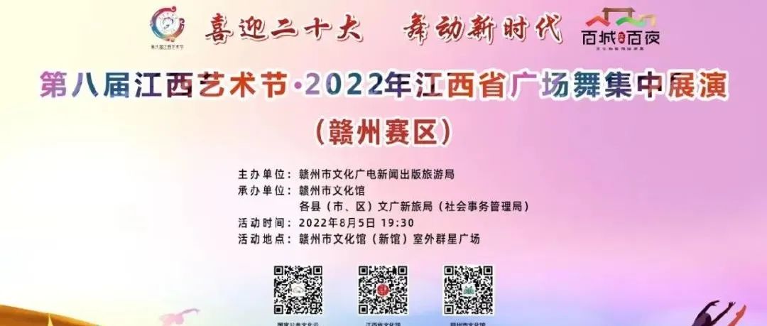 8月5日,第八届江西艺术节2022年江西省广场舞集中展演(赣州赛区)将在赣州市文化馆(新馆)室外群星广场举行,并由国家公共文化云同步网络直播。快来围观吧!此次展演以广场舞形式展现新时代新风貌,同时以新媒体为媒介,通过网络展演、网络直播的形式将赣州赛区的广场舞…