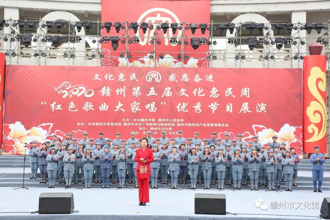 传承红色基因弘扬苏区精神1月12日上午赣南儿女以红色歌曲大家唱的形式表达对伟大祖国的深情祝福↓↓↓1月12日上午,“文化惠民 感恩奋进”2020赣州第五届文化惠民周活动之“红色歌曲大家唱”优秀节目展演在赣州市黄金广场举行,来自各县(市、区)文化馆选送16首经典红色…