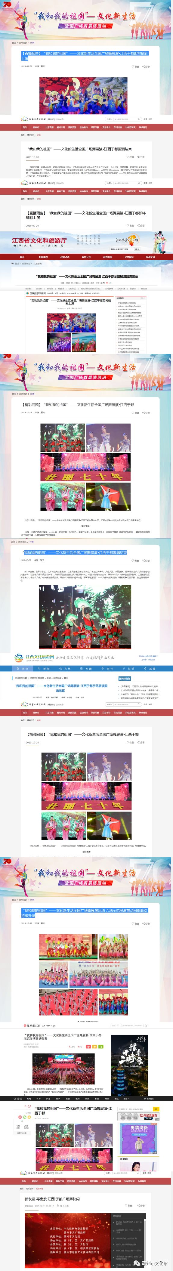 2019年9月29日晚,中央红军长征集结出发地——江西省于都县长征广场人山人海、热闹非凡,由文化和旅游部公共服务司、江西省文化和旅游厅指导,文化和旅游部全国公共文化发展中心、中国文化馆协会主办,赣州市文化广电新闻出版旅游局、江西省群众艺术馆承办,于都县文化广电新闻出版旅游局、赣州市文化馆执行承办的“我和我的祖国”——文化新生活全国广场舞展演活动在这里火热开展。整场展演分为“逐浪·赣江春晓”“弄潮·踏歌起舞”“扬帆·感恩奋进”三个篇章。民族民间舞、现代舞、古典舞、流行舞、健身操、团体操等多种舞蹈与广场舞融合,展现赣鄱文化风,传递健康正能量,充分展现出江西人民昂扬向上的精神风貌,新时代的幸福感、获得感和全省基层群众文化的繁荣气象。