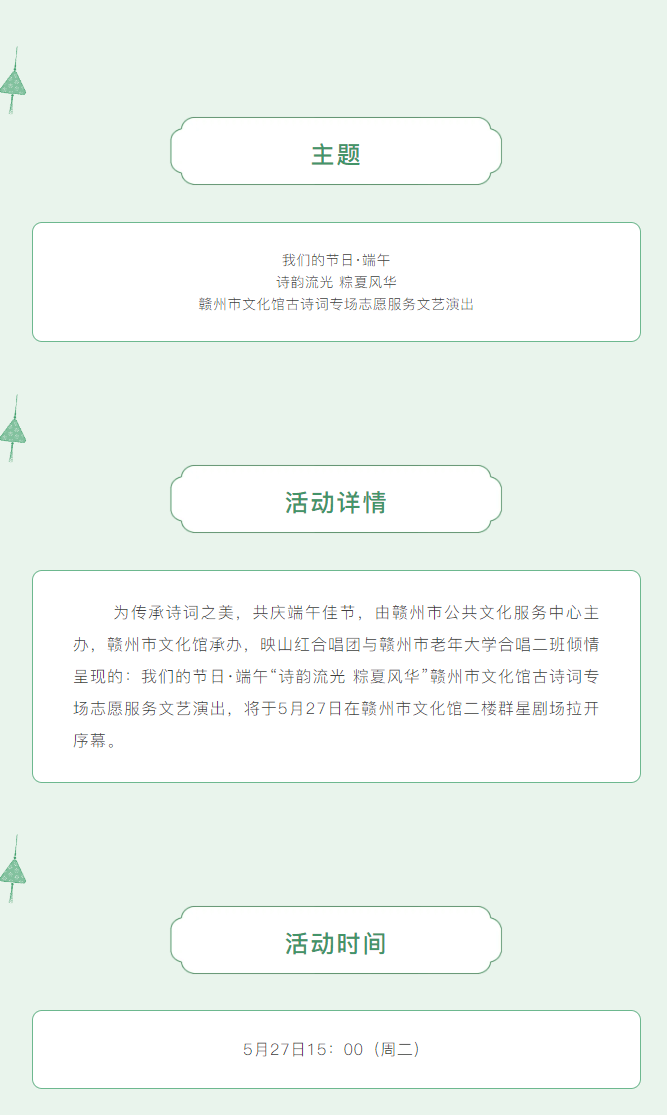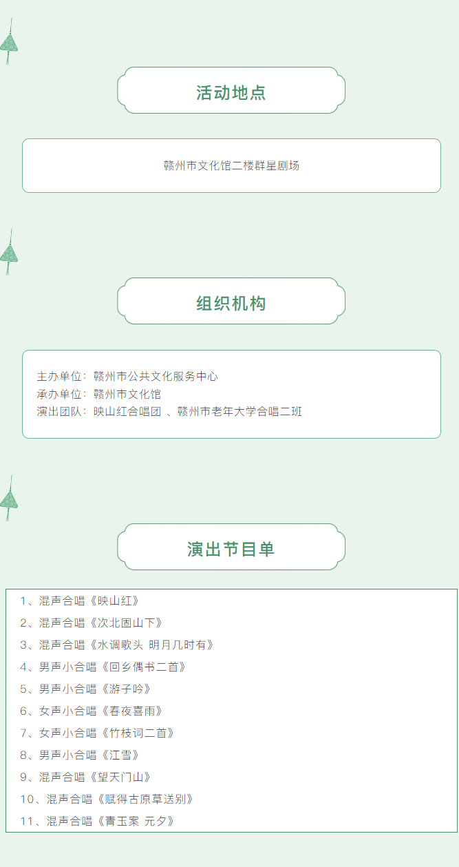 ※ 特别声明:本公众号仅用于赣州市文化馆公共文化服务及群众文化艺术普及,不用于任何商业用途。所转载文章及图片、视频、音频等版权均属原作者。如有侵权,请及时与本公众号联系。