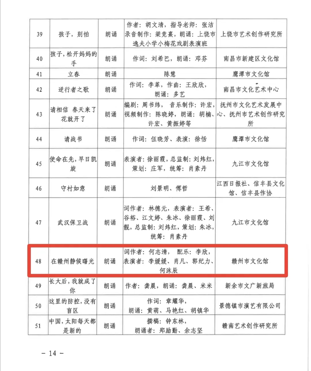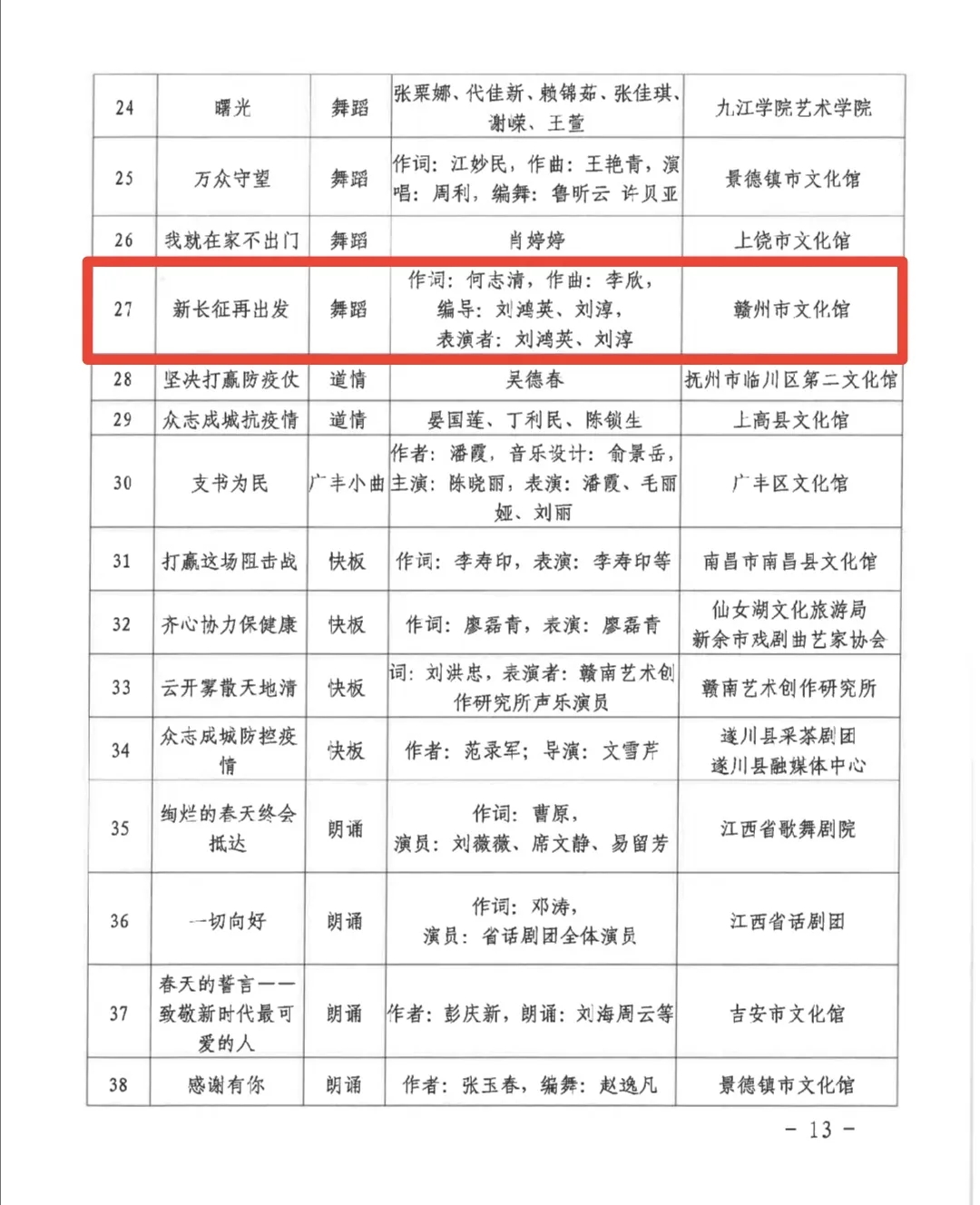 近日,江西省文化和旅游厅组织了江西省优秀抗疫艺术作品评选工作,从全省各地、各单位推荐的音乐、美术、戏剧(舞蹈、曲艺)三大类别的艺术作品中,评选出了优秀抗疫艺术作品。其中,赣州市文化馆选送的5件作品入选,分别是歌曲《爱是桥梁》《春天里的一面旗》《久别重逢》、朗诵《在赣州静候曙光》及舞蹈《新长征 再出发》。