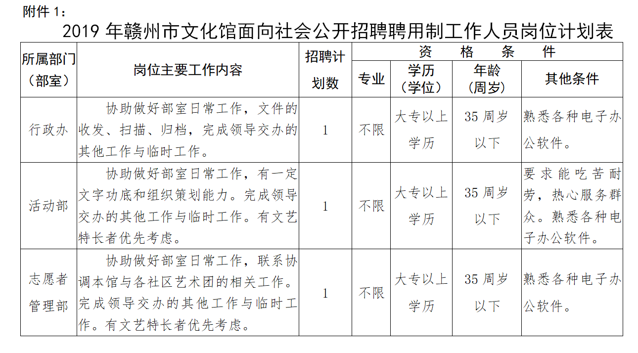 附件:1.2019年赣州市文化馆面向社会公开招聘聘用制工作人员岗位计划表