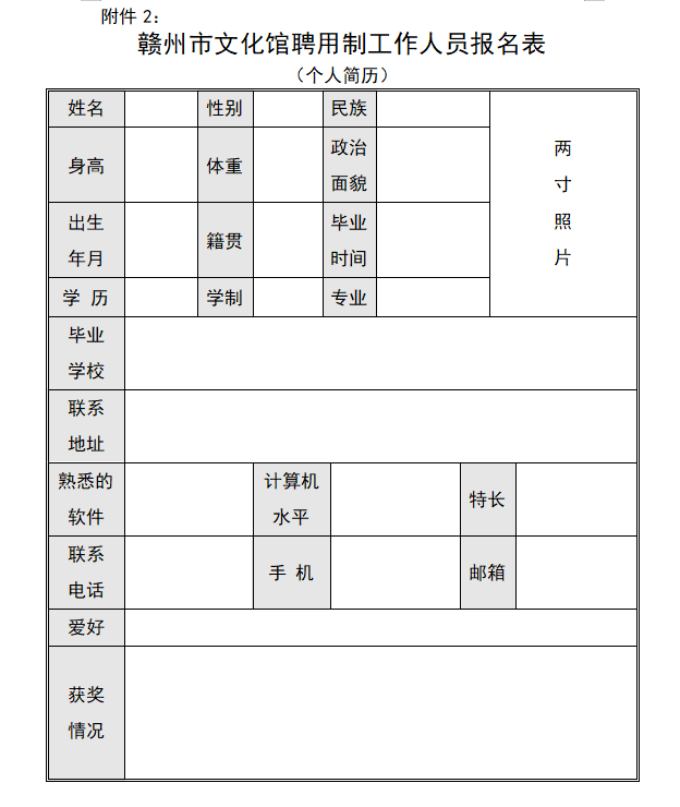 邮箱报名:有意者请按要求下载并填写《赣州市文化馆报名表》,并将相关报名材料:身份证、毕业证、学位证等扫描件发至报名邮箱:gzs_whg@163.com(邮件名称和附件名称均为姓名+应聘岗位+手机号码)。