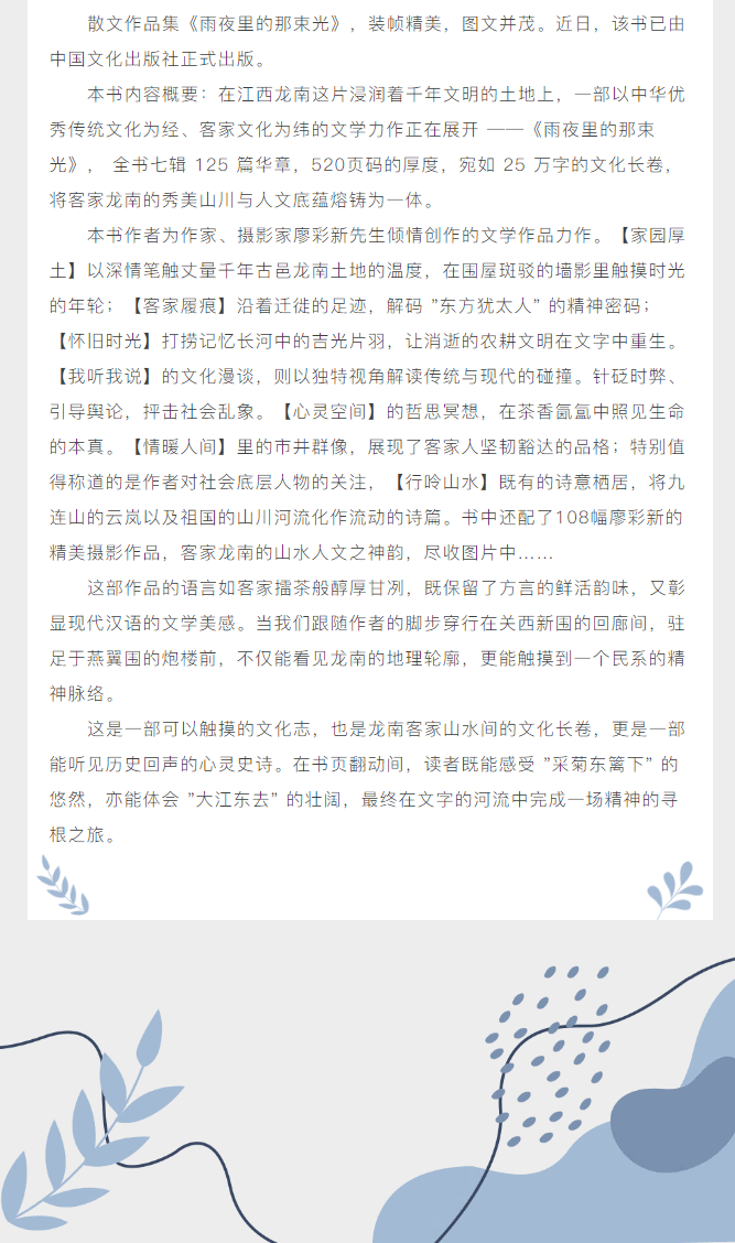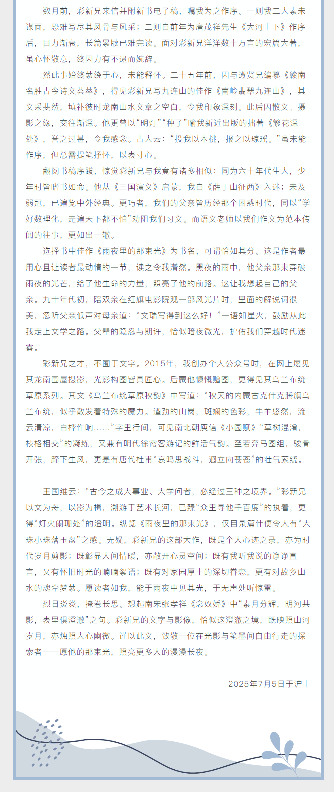 当前位置: 首页 > 文化动态 > 群文者说 | 收讫彩新兄——《雨夜里的那束光》有感