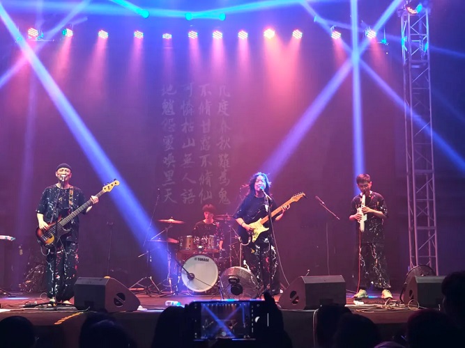 压轴登场的是来自景德镇的“文艺复兴”乐队。他们的音乐极具山水韵味和人文诗意。迄今,乐队已发行5张全长音乐专辑,每张专辑围绕不同故事主题和概念展开,并采用相应的音乐风格呈现。因其艺术性的创作和独特的舞台形式,被乐迷戏称为“赣东北乡土文化艺术团”。现场演绎的《叶青龙》《埋水》《满世》等作品,结合实验性的戏剧表演,为观众带来视听双重享受,令人仿佛置身动人画卷。