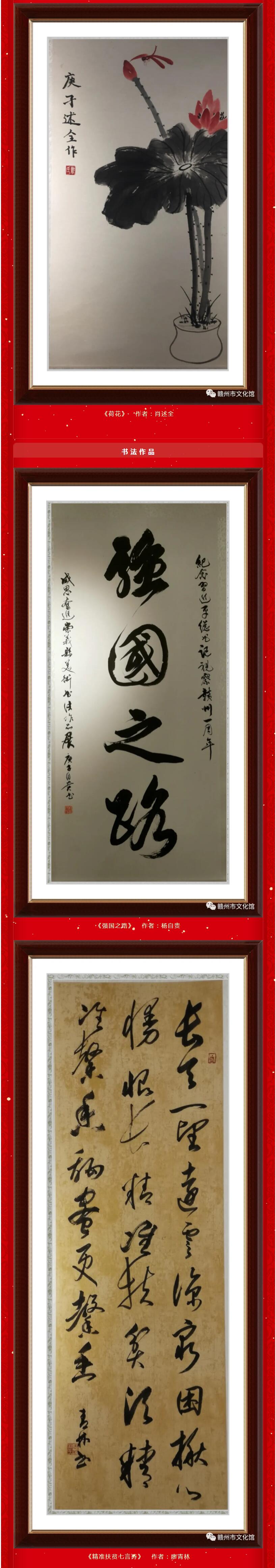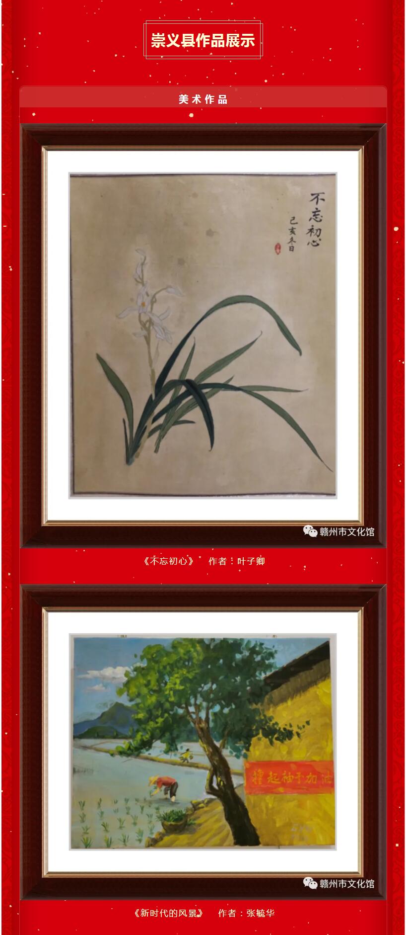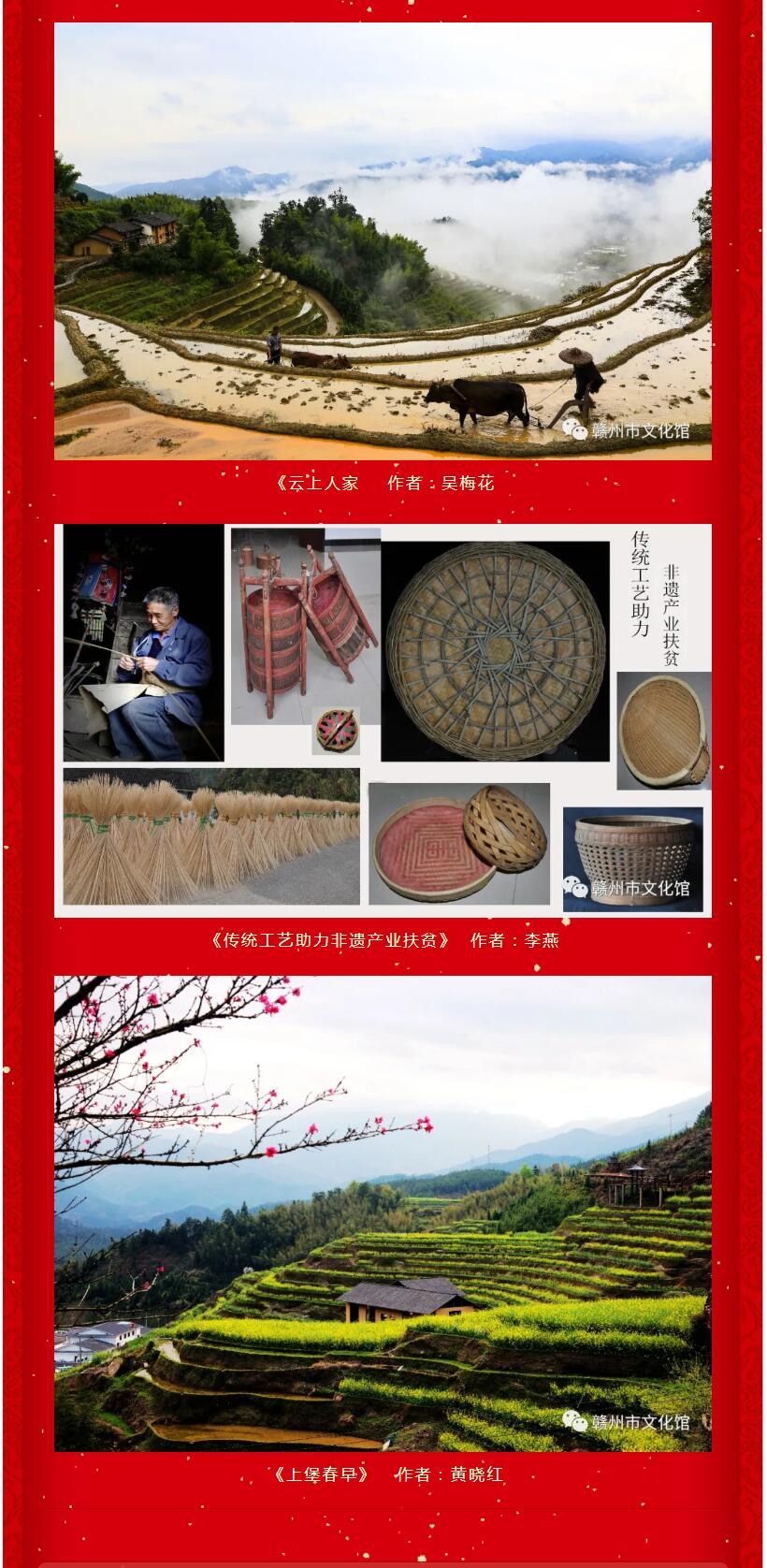 现从中择优整理编辑,美术、书法作品以“百年辉煌 继往开来”为主,摄影作品侧重于“民俗光影 幸福赣州”方面,文学类作品以“我的春节故事”为重点,通过赣南文化云网站、赣州市文化馆微信公众号进行“云展示”。我们站在“两个一百年”奋斗目标的历史交汇点上,观赏这一幅幅、一篇篇、一段段作品时,感悟到人民群众对祖国和家乡振兴发展的赞美之情,更加深刻感受到中国共产党的百年历程和伟大业绩,百年大党的梦想与追求、情怀与担当,从而勠力同心开启新时代的新征程!