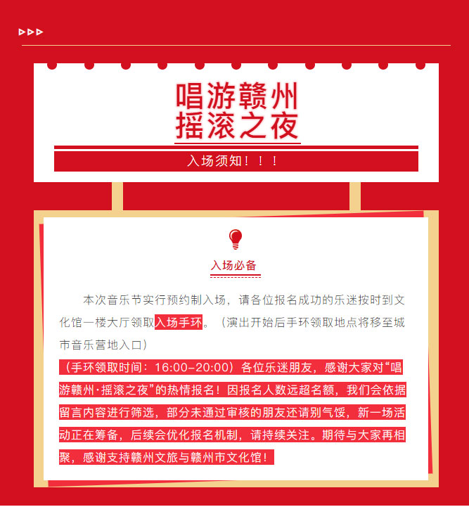 当前位置: 首页 > 文化动态 > 唱游赣州摇滚之夜 | 演出即将开启,请查收您的这份入场须知!