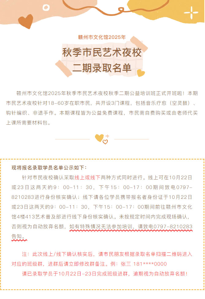 赣州市文化馆2025年秋季市民艺术夜校二期录取名单