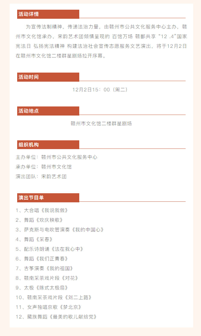 活动预告 | 百馆万场 赣鄱共享 “12 .4”国家宪法日 弘扬宪法精神 构建法治社会宣传志愿服务文艺演出预告