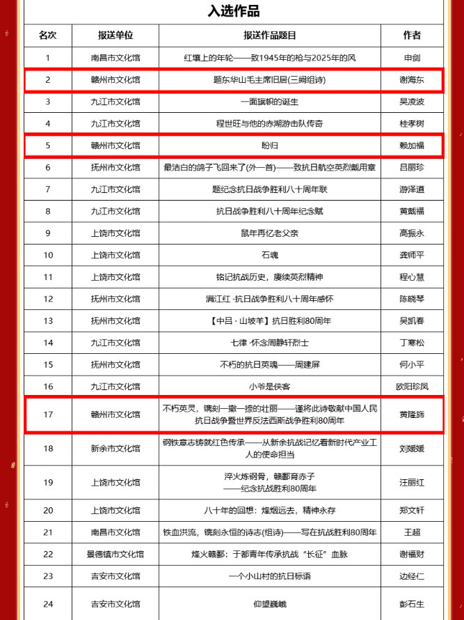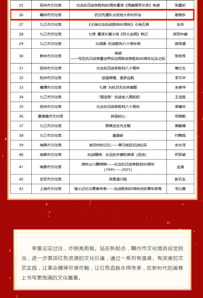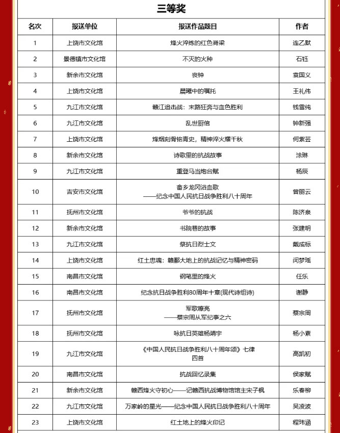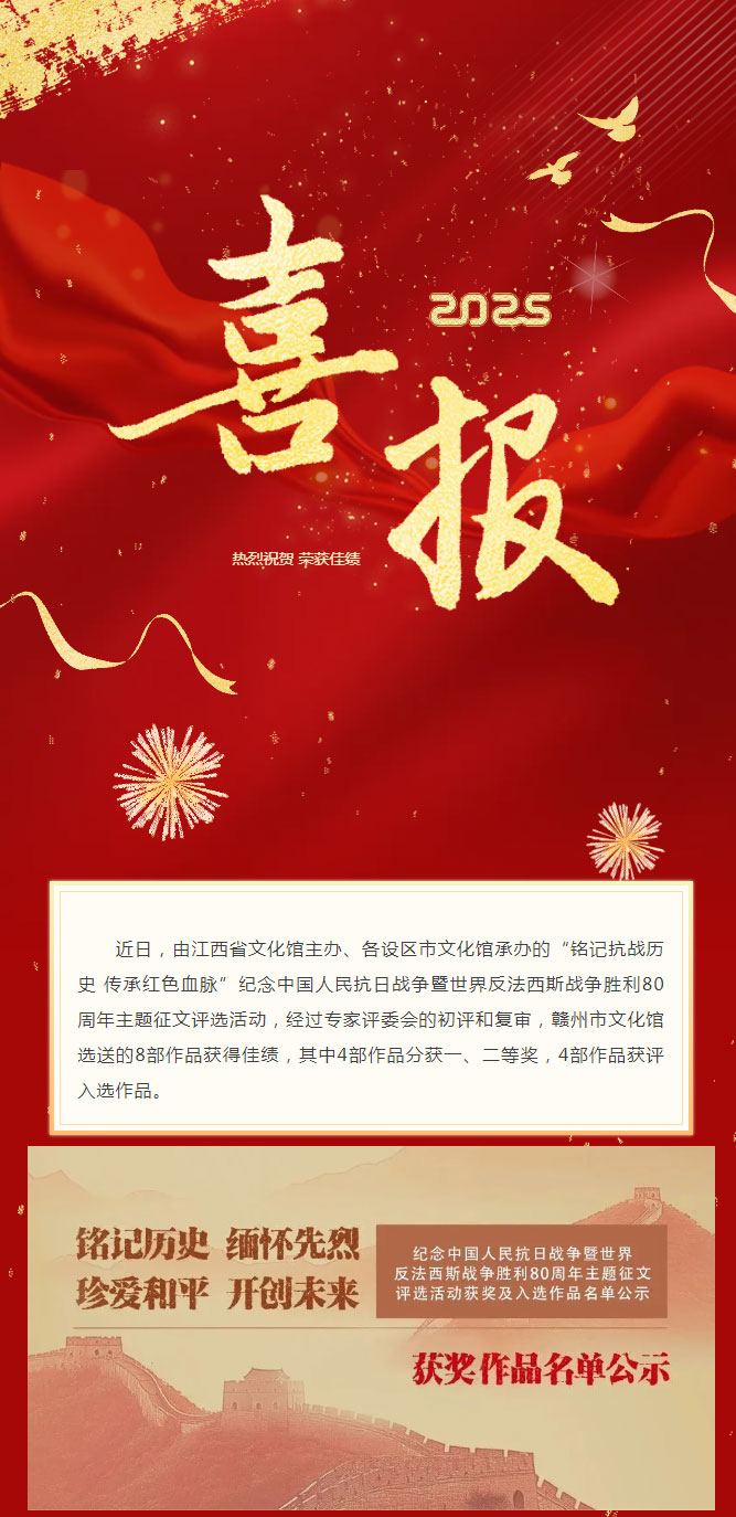 当前位置: 首页 > 文化动态 > 喜报丨我市在纪念中国人民抗日战争暨世界反法西斯战争胜利80周年主题征文评选活动中荣获佳绩!