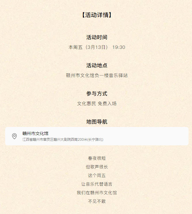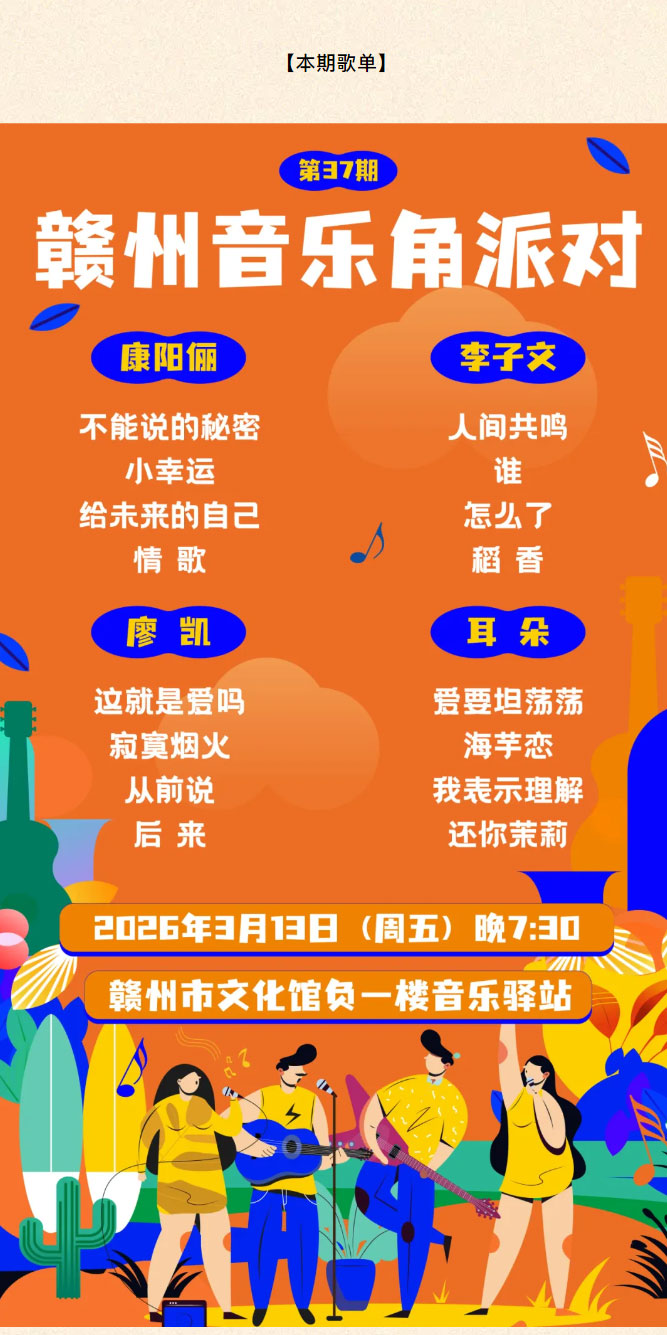 当前位置: 首页 > 文化动态 > 赣文轻骑兵 | 第37期音乐角春日音乐派对,本周五晚温暖开唱!