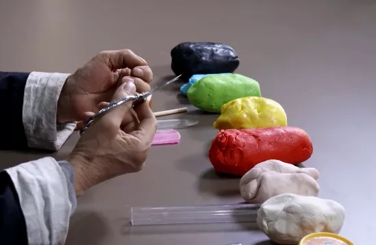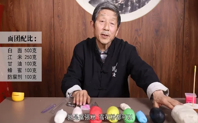 做面塑首先要准备五颜六色的面团,面团主要是白面和江米,其它需要甘油、蜂蜜和防腐剂进行调配,然后用广告色或者水彩色调制出不同颜色的面团。
