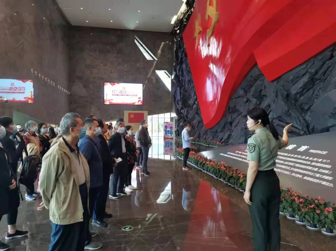 在南方红军三年游击战争纪念馆一楼序厅,一座以中国工农红军军旗为主雕塑的大型浮雕令人震撼,巨型红旗破山而出,迎风招展,高高飘扬,气势如虹。在参观了纪念馆陈列的一件件革命文物,聆听了一个个真实感人的革命故事,体验了VR全景式还原的战争情景,从红军游击队在与党中央失去一切联络的极端困境中,与十倍甚至数百倍的国民党反动派浴血奋战的三年艰苦岁月中,全体党员干部、同志切身感受到我党我军不畏险阻、艰苦奋斗的崇高精神。