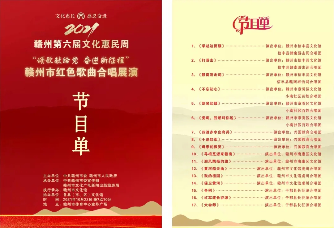 为庆祝中国共产党百年华诞,展示我市广大市民的精神风貌,传承红色基因,弘扬红色文化,强化初心使命意识,进一步丰富群众文化生活,推动我市群众文化繁荣发展,10月22日19时10分,2021赣州第六届文化惠民周“颂歌献给党 奋进新征程”赣州市红色歌曲合唱展演将在赣州市体育中心室外广场举行。