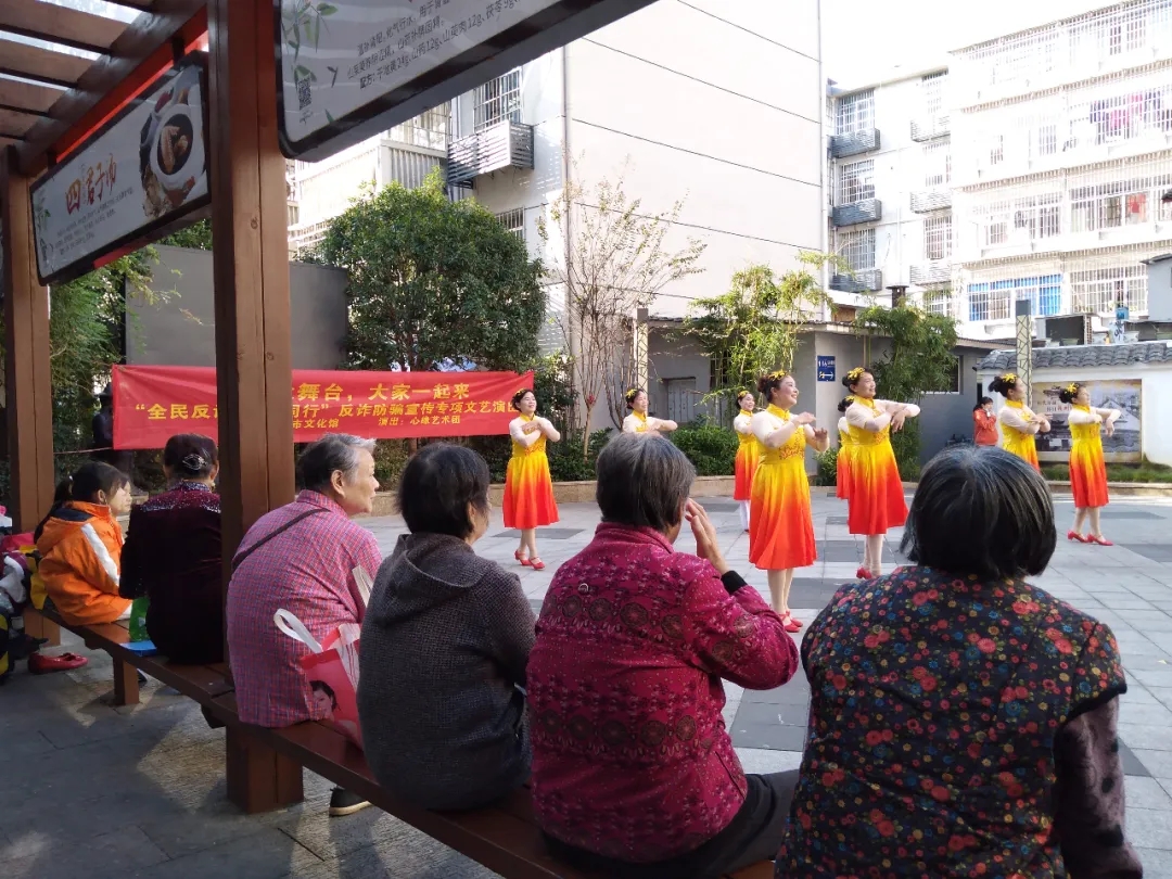 ▲11月9日、11日、19日,心缘艺术团分别在白马庙舞台、红环路社区志愿者服务广场、钓鱼社区举行“‘百姓大舞台,大家一起来’全民反诈.你我同行”宣传文艺演出。