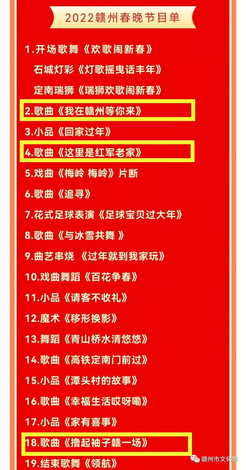 据了解,2022赣州春晚主题为“永远跟党走,欢度幸福年”,通过源自赣州各县(市、区)一线群众代表地方特色的文艺作品,讴歌广大干部职工和群众百姓在大力实施工业倍增升级、科技创新赋能、深化改革开放、乡村全面振兴、城市能级提升、美丽赣州建设、提高民生品质、党建质量过硬“八大行动”的辛勤努力和担当奉献,激励全市人民以滚烫的誓言、满腔的斗志、不竭的干劲投入到我市新时代赣南苏区振兴发展、打造对接融入粤港澳大湾区桥头堡、建设省域副中心城市“三大战略”,彰显赣州工业强市、开放高地、创业之州、区域中心、文化名城等城市新名片,不断开创高质量跨越式发展新局面,奋力谱写全面建设社会主义现代化国家赣州篇章。