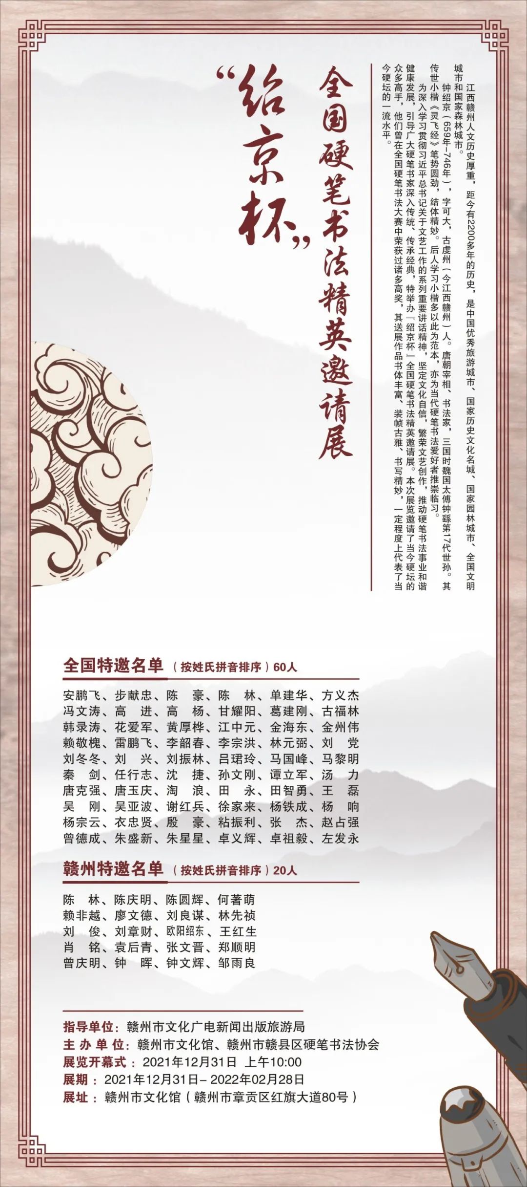 日前,“绍京杯”全国硬笔书法精英邀请展在赣州市文化馆展出,此次展览汇集了全国60名精英硬笔书法家与20名赣州特邀书法家,共80幅硬笔书法作品。展出作品书体丰富、笔法精妙、装帧古雅,一定程度上反映了当今“硬坛”的一流水平,具有广泛的代表性和较高的艺术水准。现将展出的高清作品进行网络展播。