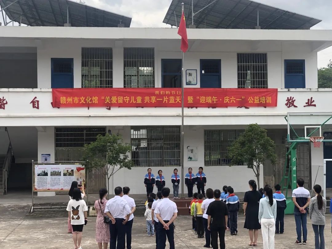 在雄壮的国歌声中,伴随着鲜艳的五星红旗冉冉升起,活动也随之正式开始。升旗仪式结束后,东田村小学的学生们为赣州市文化馆的老师们佩戴上了鲜艳的红领巾,学生代表进行发言。