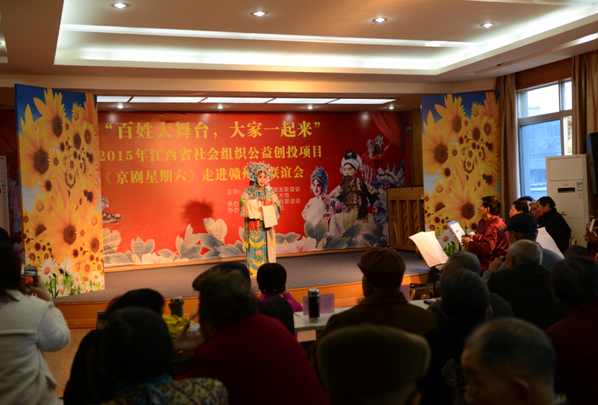 为弘扬国粹,提升我市京剧演出活力,活跃群众文化生活, 11月28日,由江西省京剧票友联谊会、赣州市群众艺术馆主办,赣州市京剧票友联谊会承办,赣州市京韵剧社协会的“百姓大舞台 大家一起来”《京剧星期六》赣州市群众艺术馆多功能厅隆重举行。本次演出的主要演员有全国京剧票友大赛“和平杯”金奖获得者尹晟嘉,银奖获得者黄华森,铜奖获得者李国芳,江西名票徐小萍、王志清,赣州市京剧界老前辈、著名演员邱慕兰、乔羽春等参与。