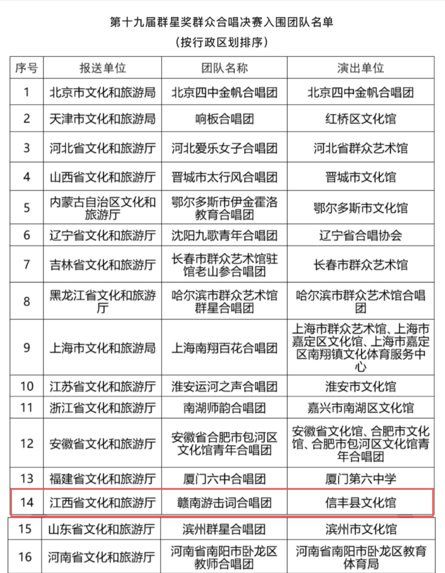 喜报!信丰赣南游击词合唱团入围全国第十九届群星奖(合唱)决赛!