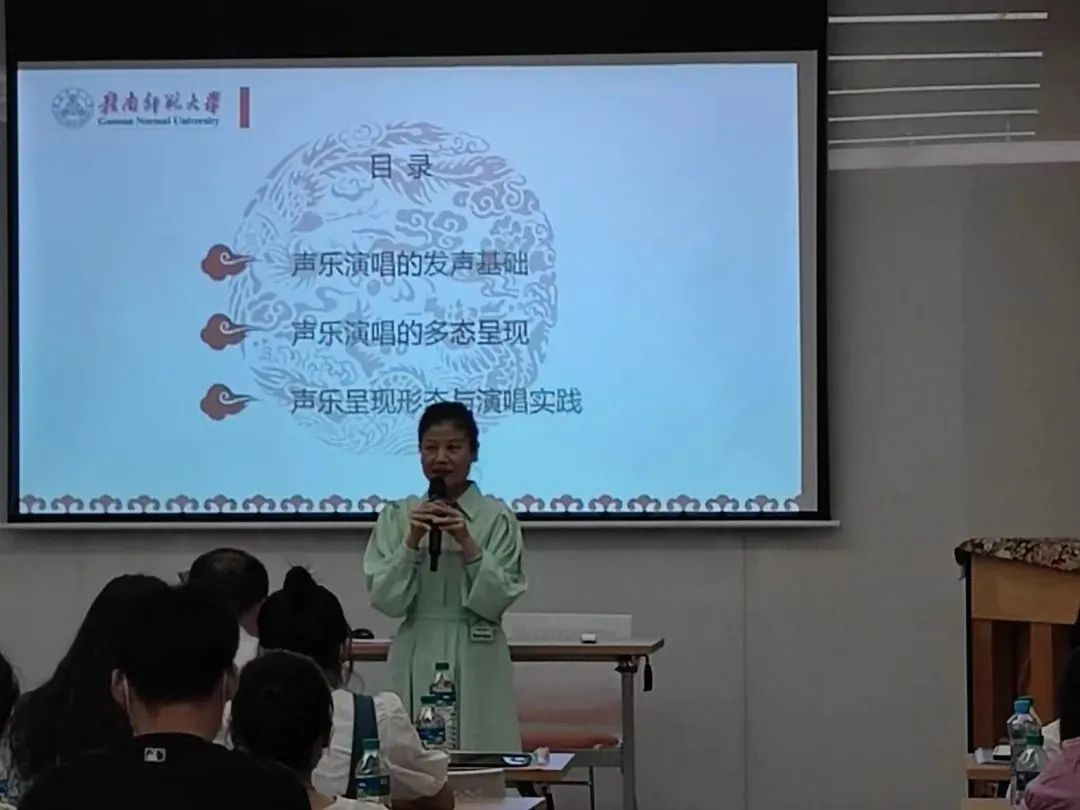 课堂上,王宇扬教授通过现场示范、现场指导和音视频范例等多种方式深入浅出的讲解了声乐的发声基础、声乐的多态呈现、声乐呈现形态与演唱实践。
