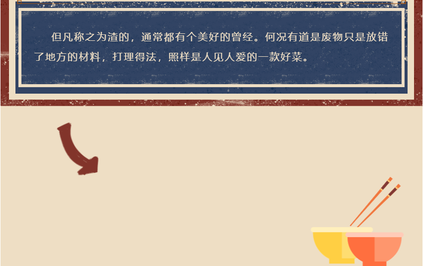 另一个大渣就是猪油渣。优质的油渣是肥肉带皮熬剩的,刚出油锅,直接吃,爆口香脆,那点皮还特别耐嚼,既想留住美感又想让人垂涎,也是几十年前穷人孩子的心态,甚至就是梦中情人,可惜酒店是没这道菜。通常油渣是用猪板油熬剩,这种油渣太松软,甚至有点太虚伪。