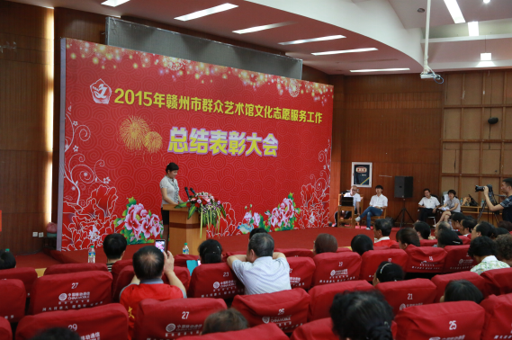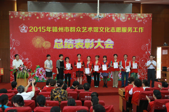 2016年5月 25 日上午9:30的市图书馆二楼功能厅,在一阵悠扬的《文化志愿者之歌》歌声中,赣州市2015年度文化志愿服务工作总结表彰大会在这里拉开了帷幕。文广新局副局长彭玲、社文科科长钟玉林到会指导。大会表彰了6个三星级先进团队,5个二星级先进团队,13个一星级先进团队和77个先进个人。先进团队代表心连心艺术团团长肖秀华和宋韵艺术团李明进代表文化志愿者在大会上发言,李媛媛馆长总结了2015年文化志愿服务工作以及存在的问题,并对2016年的重点工作作了布署。彭玲副局长的发言中代表市文广新局对大会的顺利召开表示祝贺,并对群艺馆和文化志愿者们提出了几点要求。最后,参会领导与文化志愿者先进团队领队和先进个人进行了合影。