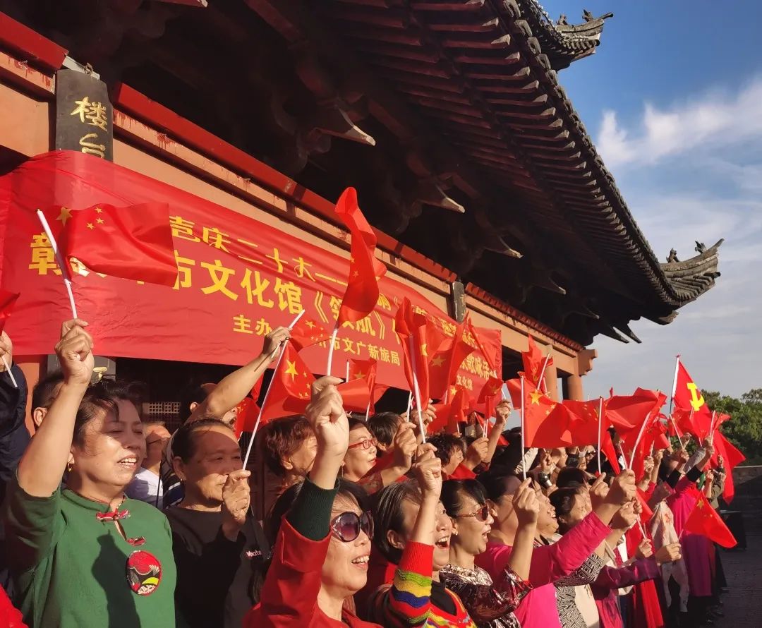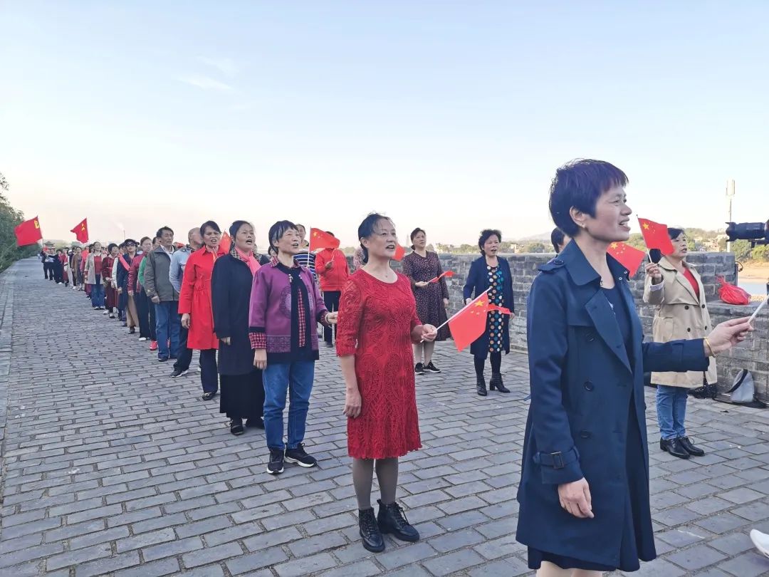 传唱过程中,文化志愿者们满怀深情的演唱吸引了周边群众热情参与,他们随着歌声的节奏挥舞着手中的五星红旗,尽情唱出了人民群众对党和祖国的热爱之情。