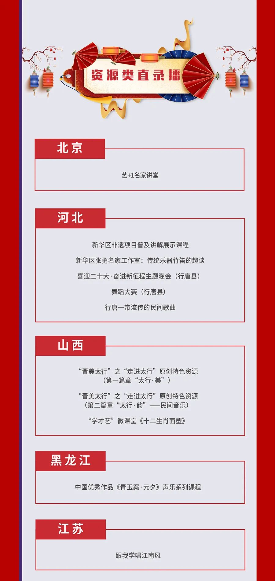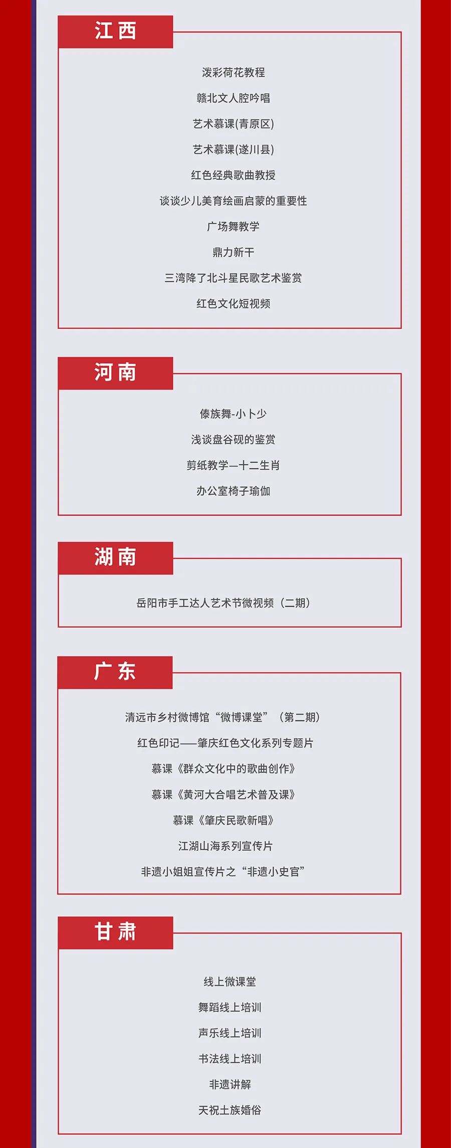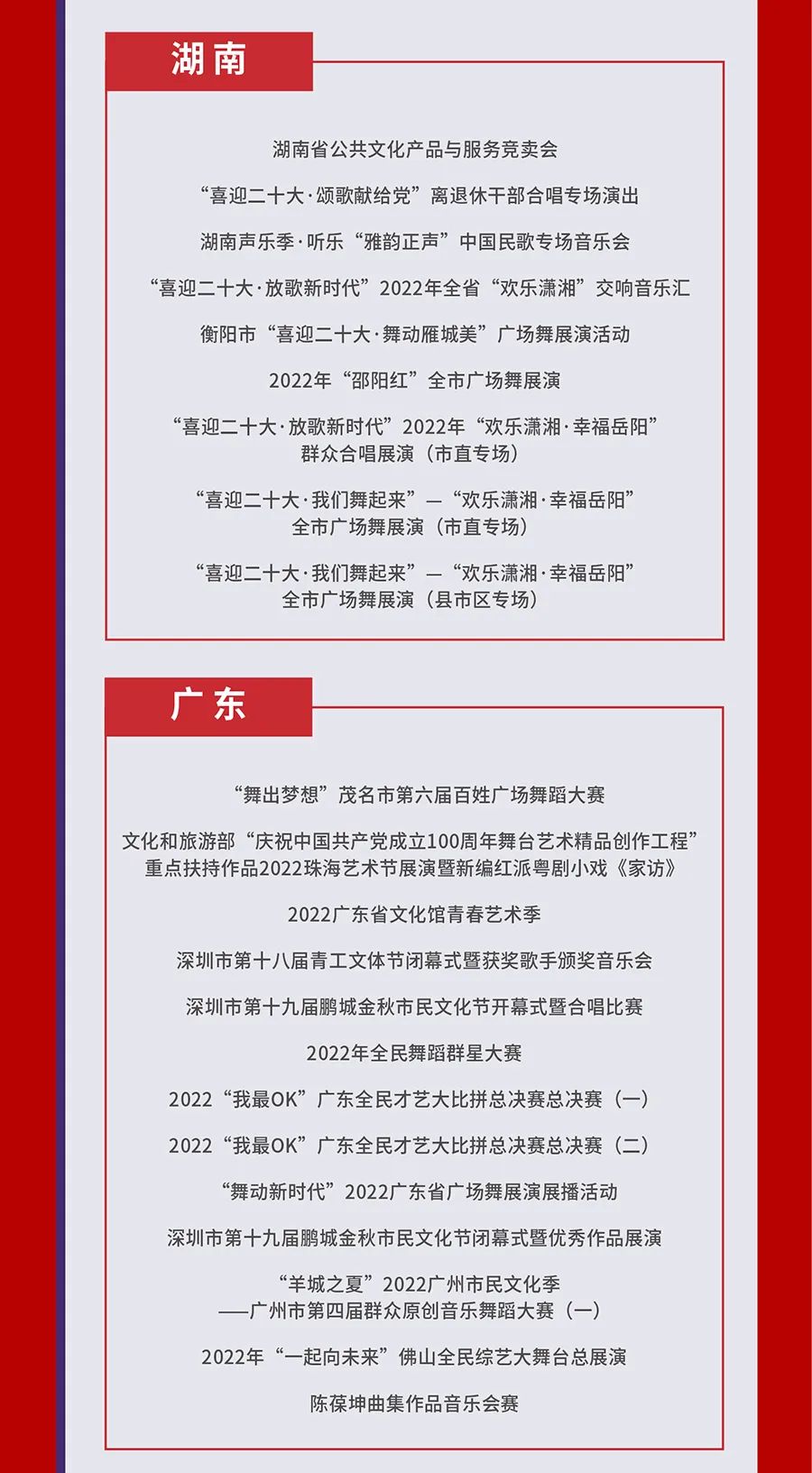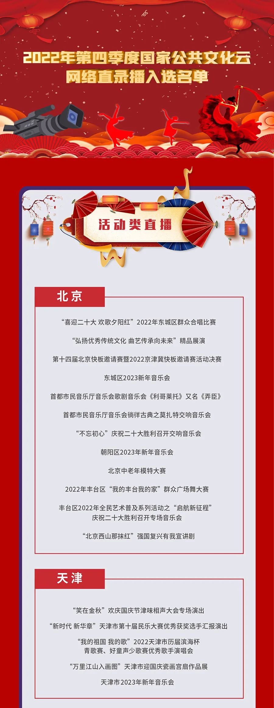 为贯彻落实《“十四五”公共文化服务体系建设规划》,推动国家公共文化云网络直录播高质量发展,深化供给侧结构性改革,提升人民群众文化获得感、幸福感,文化和旅游部全国公共文化发展中心组织开展了2022年第四季度国家公共文化云网络直录播遴选工作,经过各地报送和审核遴选,共有233场活动类直录播(直播150场,录播83场),67场资源类直录播入选2022年第四季度国家公共文化云网络直录播计划,其中,赣州有2场直播、1场录播入选,现予公布,敬请期待。
