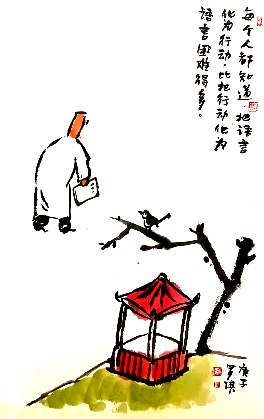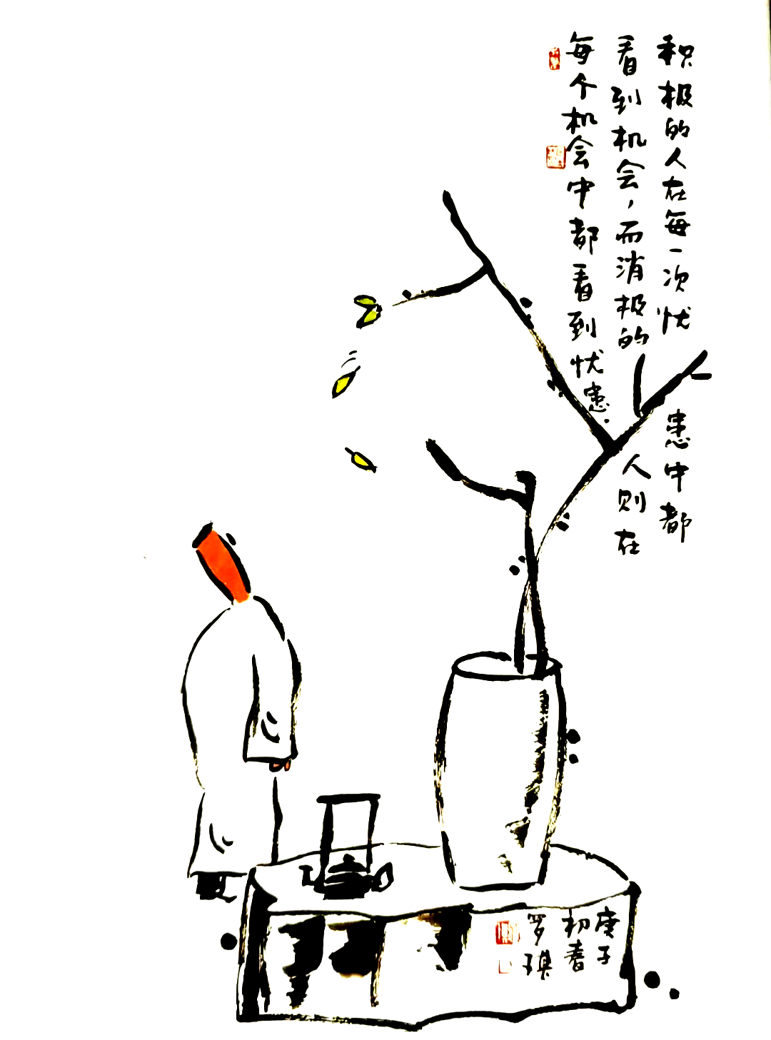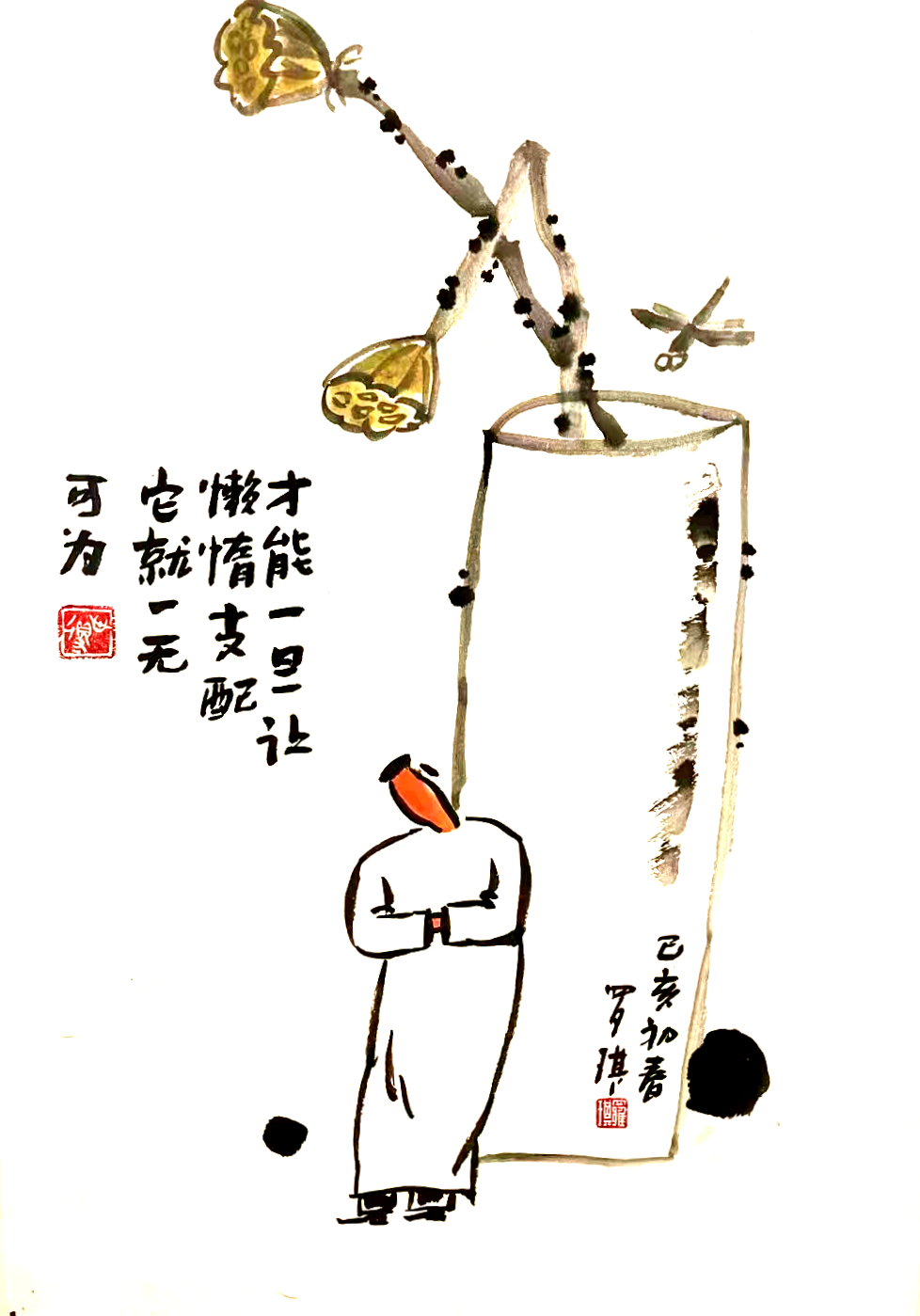 罗琪哲理水墨漫画作品,思想上蕴含着他对人生对生活的思索和领悟,娴熟的水墨运用,尽展他对传统文化的理解和把握。画中诗书画印和谐统一,“简、雅、拙、淡”,计白当黑,惜墨如金,画面显现出清净空灵之美。正如罗琪在作品中所说:“美是到处都有的,只有真诚和富有感情的人,才能发现它”。我们在欣赏艺术的美感时,不经意间会把自身的感受和经历,融入到艺术表达中。