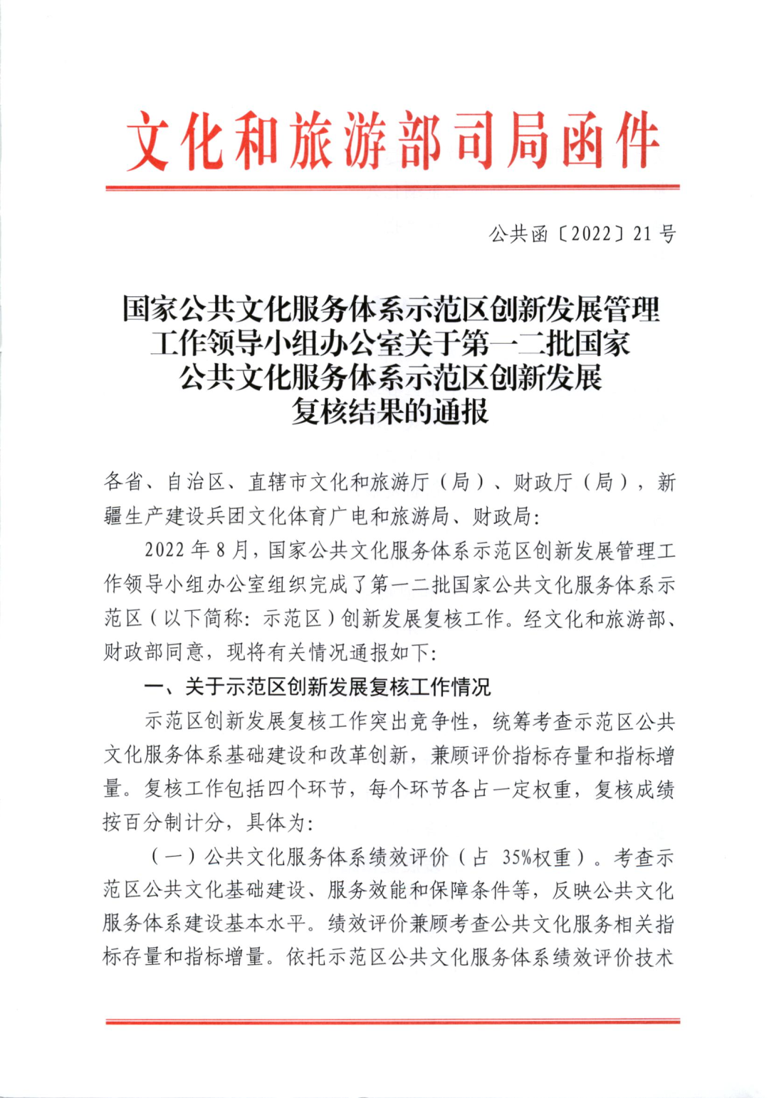 近日,国家公共文化服务体系示范区创新发展管理工作领导小组办公室公布第一、二批国家公共文化服务体系示范区创新发展复核结果, 我市作为国家首批公共文化服务体系示范区,在绩效资料评价、过程管理评价、第三方暗访、群众满意度测评和创新成果评审答辩等复核环节中成绩优异,在中部地区20个城市中表现突出,获评优秀等次。