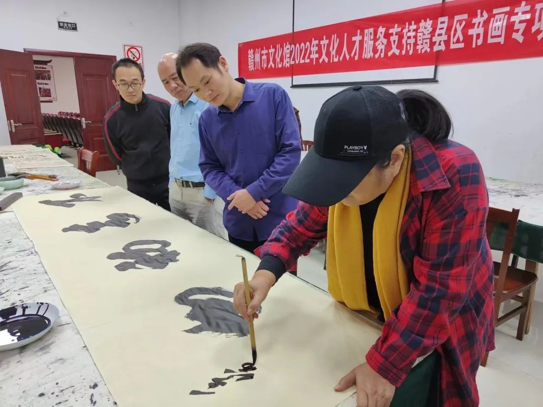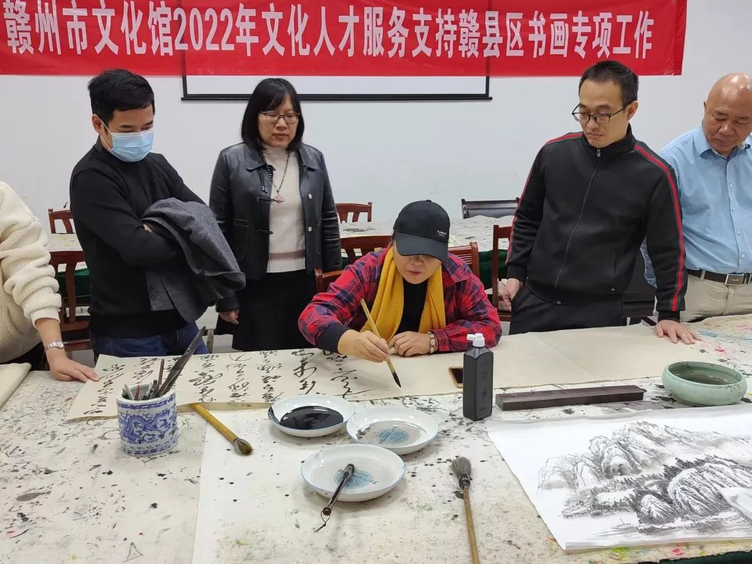 为贯彻落实文化和旅游部办公厅、财政部办公厅《2021——2022年文化人才服务支持艰苦边远地区和基层一线专项实施方案》精神,进一步提高我市基层群众文化工作者为群众文化服务的思想意识,提升基层文化服务水平,11月17日上午,由赣州市文化馆主办、赣县文化馆协办的“书画交流笔会”在赣县区文化馆圆满举行。赣州市文化馆党支部副书记刘亮、市文化馆书画家冯霄、赖俐华等一行参加了此次活动。
