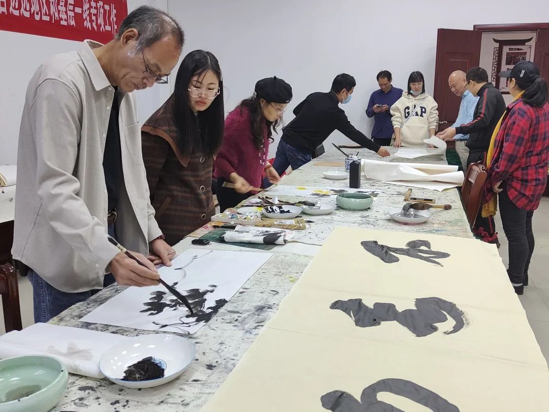 市文化工作者与赣县区基层文化工作者们在此以笔会友,以画交心,共同领略中华文化的精粹、探讨书画创作方向,畅谈书画心得,共品文化之美,也有青年书画爱好者争相挥毫泼墨,书写字画,虚心向老师们请教。现场墨香四溢,其乐融融。
