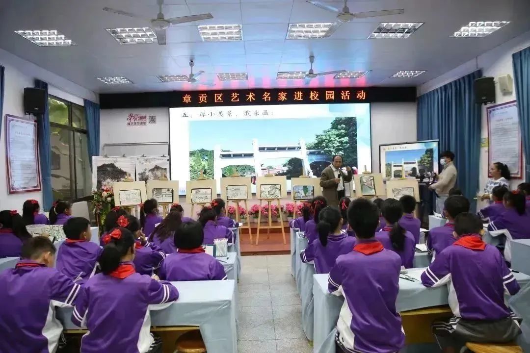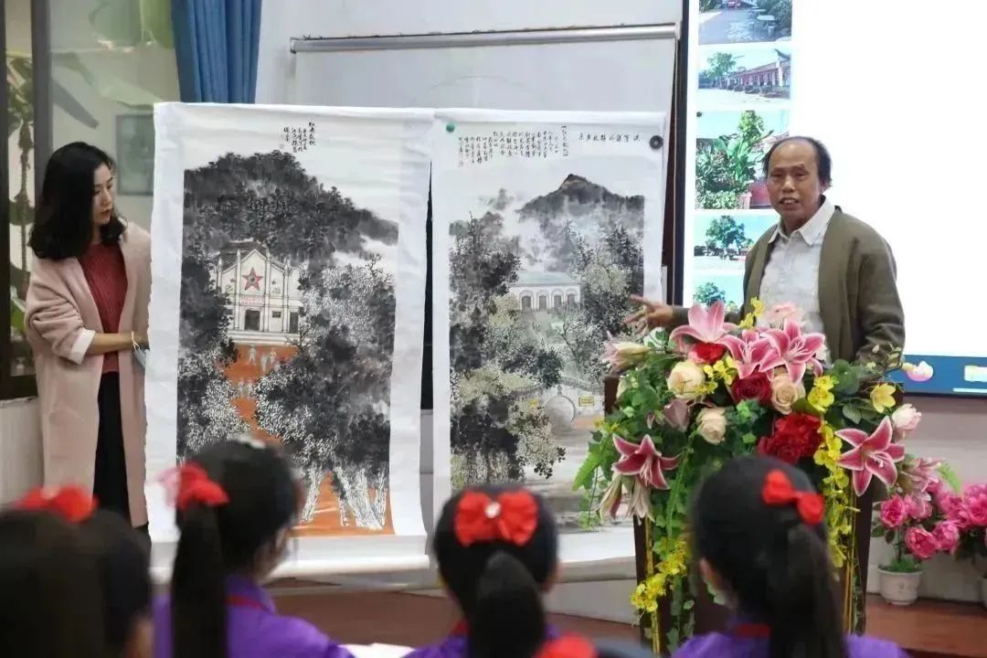 11月2日,章贡区文化馆组织文化志愿者张义宾走进赣州市厚德路小学给学生上了一堂生动的“红色文艺作品赏析”课。课堂上,张义宾以自己的创作的具有赣南本土特色的红色题材作品——中共华南分局扩大会议暨叶剑英住地旧址教授红色题材绘画作品创作的方法、技巧,结合色彩、光影、写意等赏析红色美术经典作品。