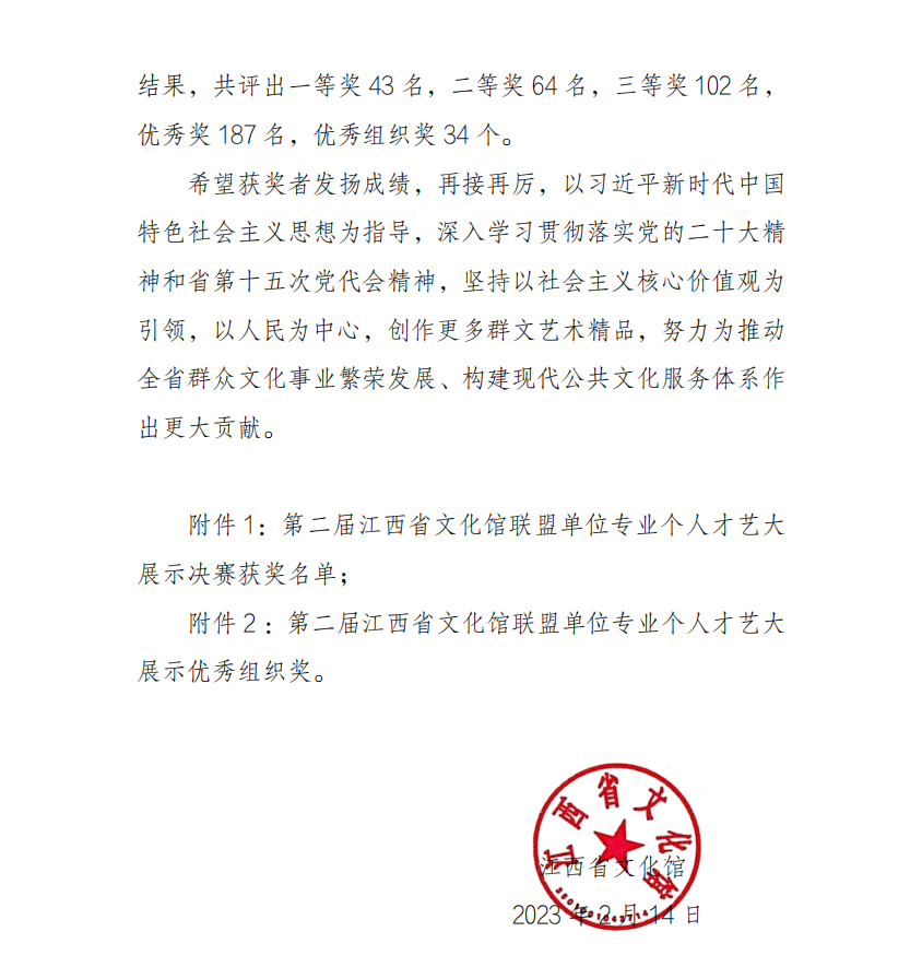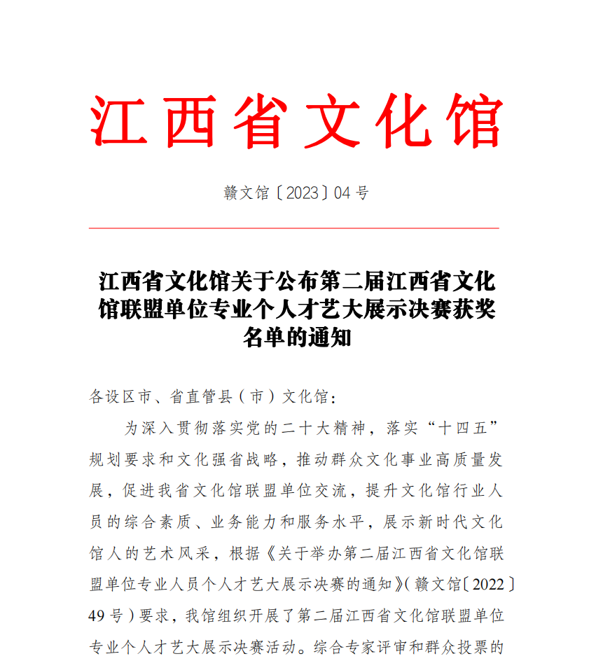 江西省文化馆公布了第二届江西省文化馆联盟单位专业个人才艺大展示决赛获奖名单,共评选出一等奖43名,二等奖64名,三等奖102 名,优秀奖187名,优秀组织奖34个。赣州各县(市、区)文化馆共斩获65个奖项,其中一等奖11个、二等奖8个、三等奖13个、优秀奖33个。赣州市共有赣州市文化馆、安远县文化馆、信丰县文化馆、全南县文化馆、赣州市南康区文化馆、大余县文化馆6个文化馆荣获优秀组织奖。赣州市文化馆黄璇甲获声乐类(通俗)类二等奖、冯霄获美术类三等奖。