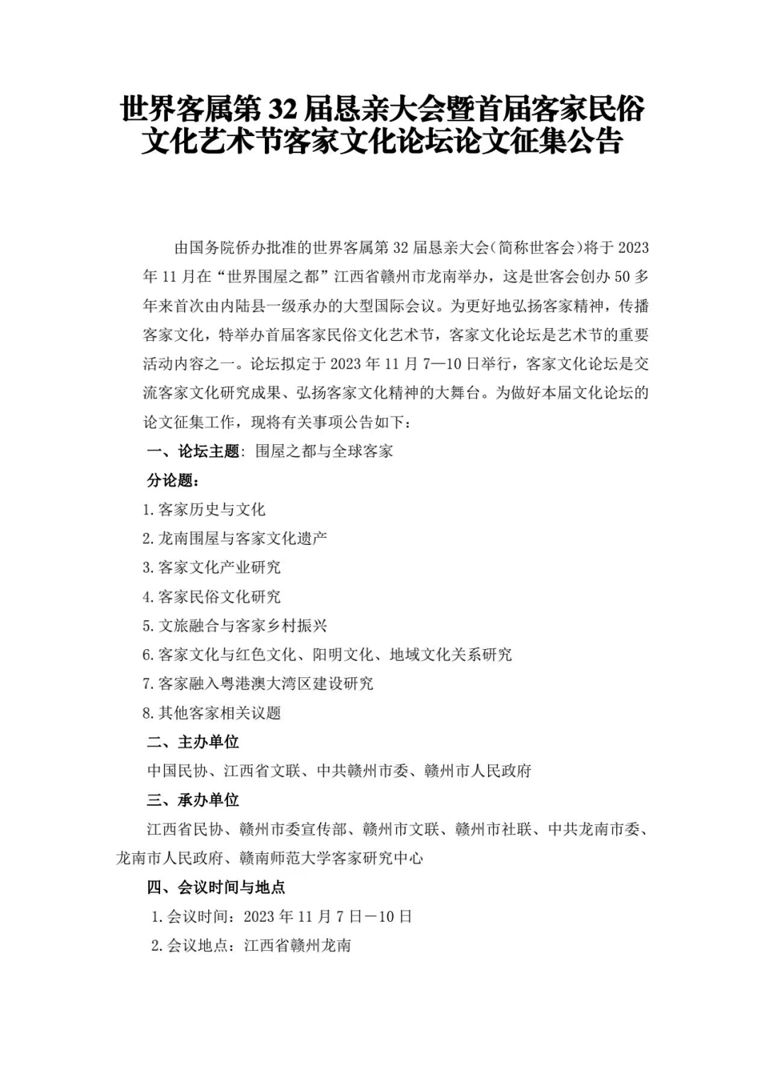 为贯彻落实习近平总书记关于“传承和弘扬中华优秀传统文化”“不断提升中华文化影响力”等重要指示,加强客家文化生态保护区建设,提升优秀传统文化国际影响力,2023年11月,将在赣州龙南举办首届客家民俗文化艺术节客家文化论坛,活动由中国民协、江西省文联、中共赣州市委、赣州市人民政府主办,江西省民协、中共赣州市委宣传部、赣州市文广新旅局、赣州市文联、中共龙南市委、龙南市人民政府承办,现面向社会征集论文。