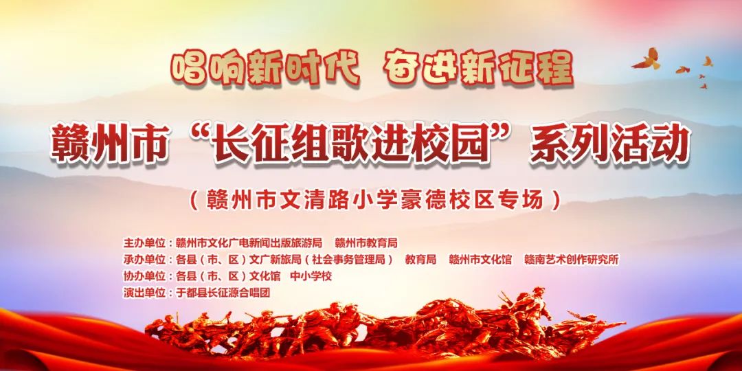 为弘扬长征精神,传承红色基因, 4月17日上午,由赣州市文广新旅局、赣州市教育局主办的“唱响新时代 奋进新征程——赣州市“长征组歌进校园”系列活动启动仪式暨首场演出,在赣州市文清路小学豪德校区成功举办。赣州市政府副秘书长温海、赣州市委教育工委副书记郭强、赣州市文广新旅局副局长夏涵涵参加启动仪式。