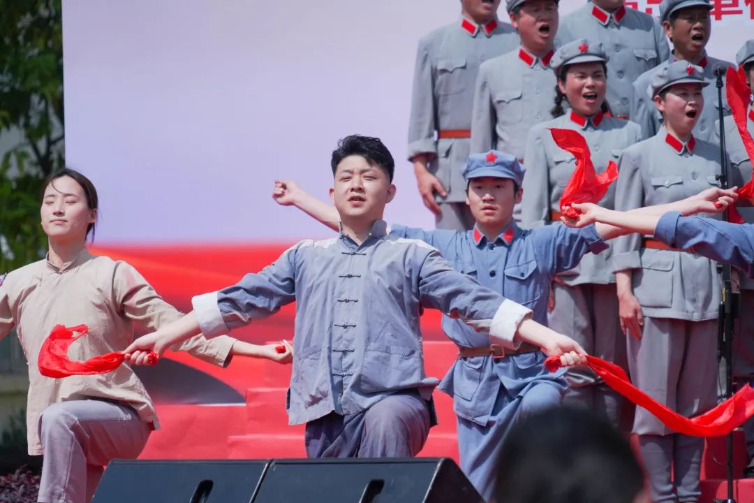 随后,于都县长征源合唱团出场,演出正式开始。全体演员身穿红军装,激情澎湃地唱响《长征组歌》。合唱与情景表演完美融合,让学生们体会雄壮激昂的旋律带来的强烈爱国情怀,感悟美好生活来之不易。
