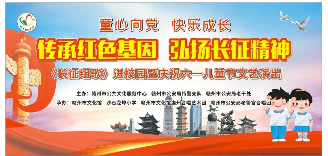 由赣州市公共文化服务中心、赣州市公安局特警支队、赣州市公安局老干处主办,赣州市文化馆、沙石龙埠小学、赣州市文化馆虔州合唱艺术团、赣州市公安局老警官合唱团承办的“传承红色基因,弘扬长征精神”——《长征组歌》进校园暨庆祝六一儿童节文艺演出将于6月1日上午8:00在赣州市沙石龙埠小学举行。
