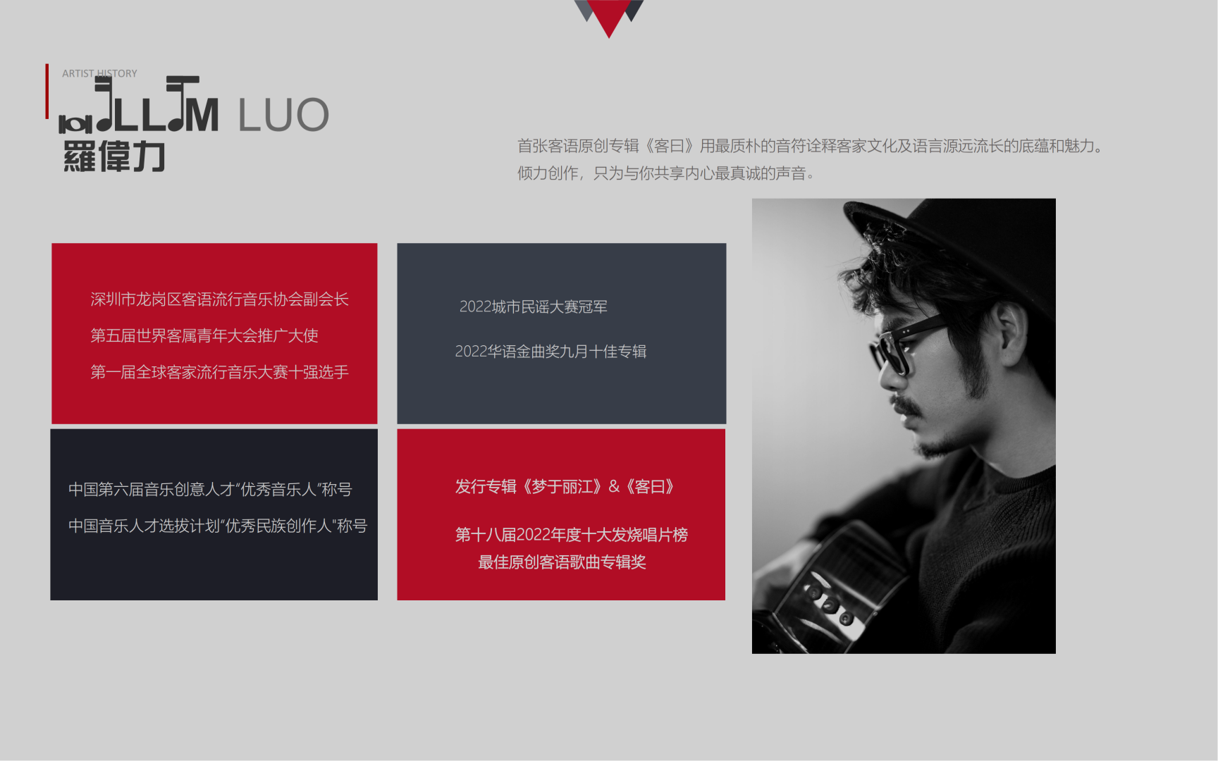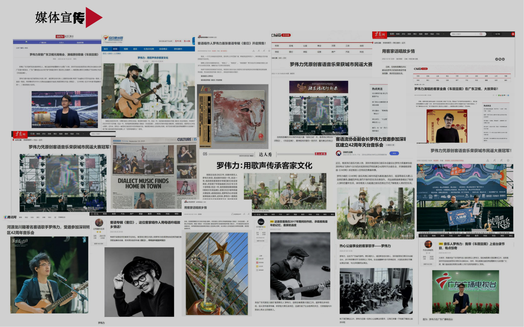 他是中国大陆“客语流行代表人物”,是各大音乐节的表演嘉宾,曾参加“惠州金山湖草地音乐节”、东莞爆米花音乐节、北京迦南美地黄金梨收获音乐节、‘中国连南,千年瑶寨’柠檬世界音乐节、深圳迷笛’15/16’跨年音乐节、上海草地音乐节、惠州“地球熄灯一小时”不插电音乐会、深圳嗨唛音乐节、肇庆鼎湖山音乐节。