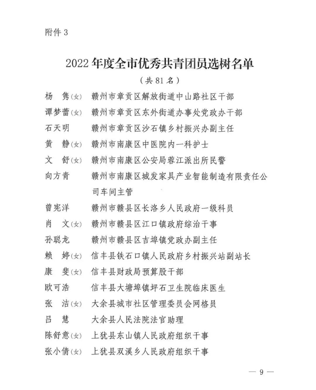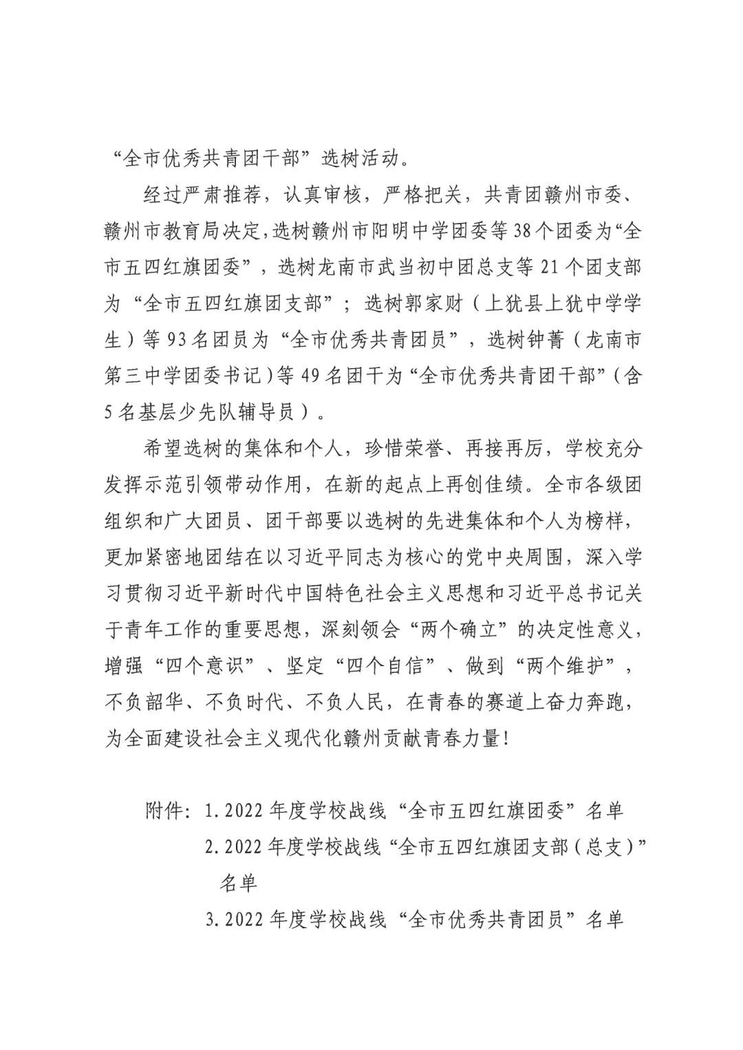 6月5日,经过严肃推荐,认真审核,严格把关,共青团赣州市委、赣州市教育局决定,选树38个团委为“全市五四红旗团委”,选树21个团支部为“全市五四红旗团支部”;选树93名团员为“全市优秀共青团员”,选树49名团干为“全市优秀共青团干部”(含5名基层少先队辅导员)。