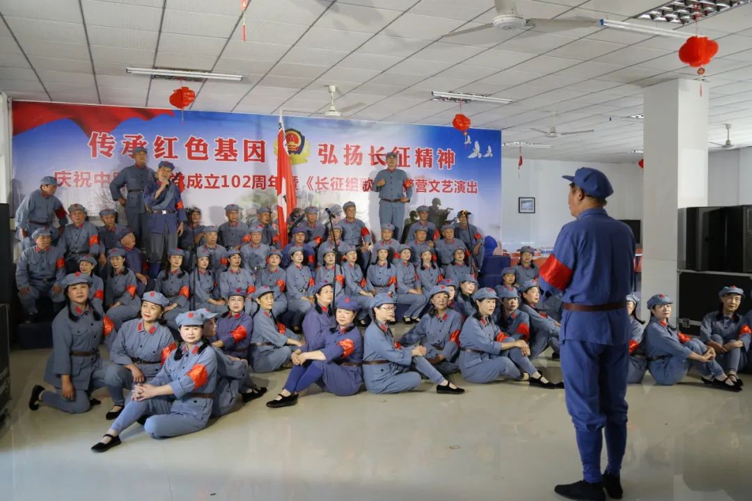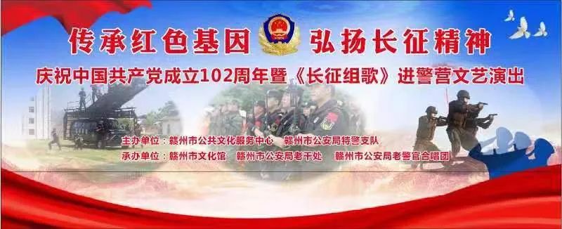 为庆祝中国共产党成立102周年,进一步丰富警营文化生活,加强警民联系,6月28日,由赣州市公共文化服务中心、赣州市公安局特警支队主办,赣州市文化馆、赣州市公安局老干处、赣州市公安局老警官合唱团承办的“传承红色基因 弘扬长征精神”——庆祝中国共产党成立102周年暨《长征组歌》进警营文艺演出活动圆满举行,共有120余位民警、文化志愿者参加了此次活动。