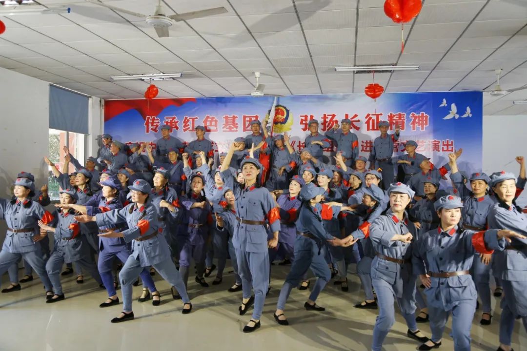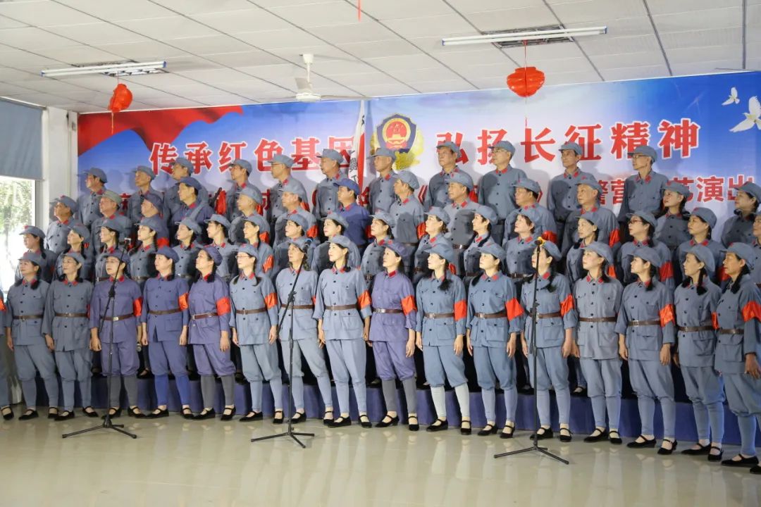 赣州市文化馆虔州合唱艺术团为民警们上演了《告别》《突破封锁线》《过雪山草地》《到吴起镇》《祝捷》《大会师》6首《长征组歌》的经典曲目,再现了长征的传奇历史,演员们充满深情的表演赢得了现场观众阵阵热烈的掌声。
