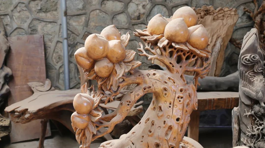 徐良慧介绍,根雕的制作过程非常复杂,每个树根制作前要先通过鲜剥或是煮泡去皮清污,去皮时需特别小心,不能破坏树根的纹理,否则就会影响成品的美感。然后根据树根的形状,确定造型,再开始雕刻。雕刻完还需进行修形,有些作品甚至要经过近百次的修改才能达到预期的效果。最后要用砂纸打磨,再上二三遍树脂漆才算全部完成。每个制作步骤容不得一丝马虎,皮一定要去得干净,不然会生虫,打磨时要将树根上的伤口痕迹磨平,再用细砂纸抛光,用力要均匀,避免破坏树根的色泽和纹理。
