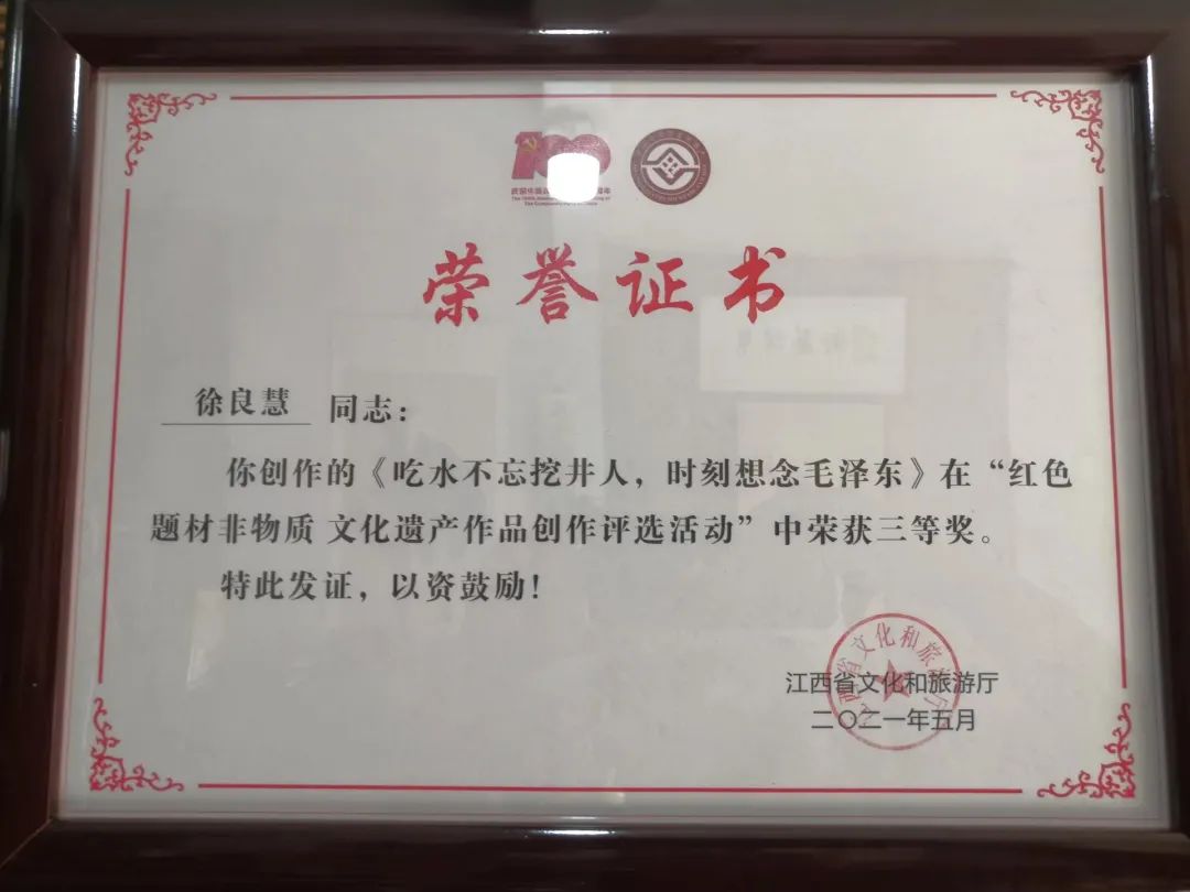 徐良慧还展示了作品《吃水不忘挖井人,时刻想念毛泽东》,该作品获得江西省“红色题材非物质文化遗产作品创作评选活动”三等奖,用客家根雕的形式挖掘展现出“吃水不忘挖井人”这一朴实故事中蕴含的深意。徐良慧表示,未来他将努力传承发扬客家文化、红色文化等传统文化的光荣传统,为新时代中国特色社会主义伟大事业和赣南革命老区的文化建设作出自己不懈的奋斗。