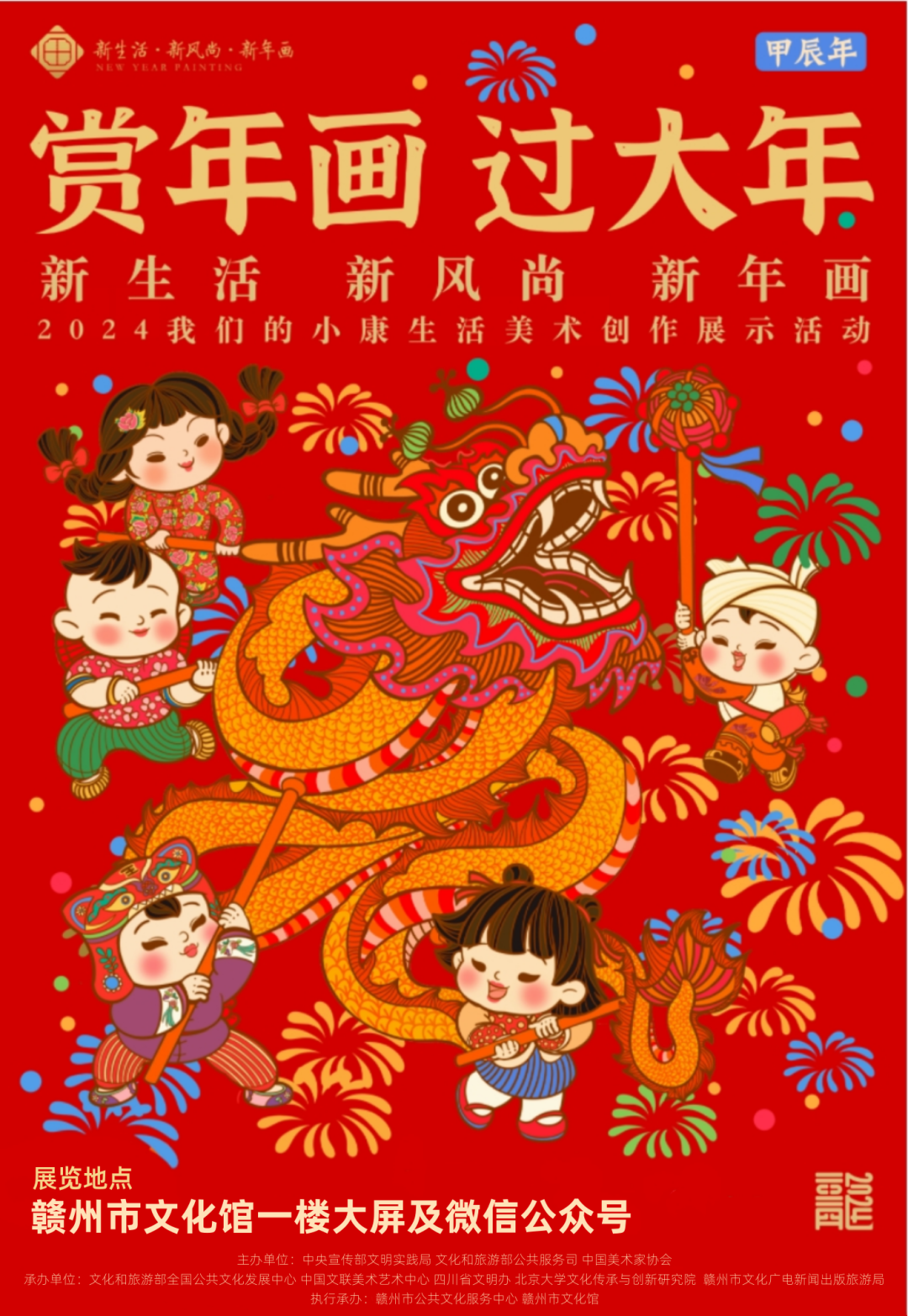 近日,中央宣传部文明实践局、文化和旅游部公共服务司、中国美术家协会举办了2024年“新生活•新风尚•新年画”——我们的小康生活美术创作展示活动。本次展览旨在以习近平新时代中国特色社会主义思想为指导,深入学习贯彻习近平文化思想,传承弘扬中华优秀传统文化,丰富人民群众精神文化生活,激励全市广大群众振奋精气神、共创新生活。赣州市文化馆现推出“新生活·新风尚·新年画”主题作品线上展览,精选来自全国各地的新年画作品,为大家献上年味儿满满的文化盛宴和新春祝福。